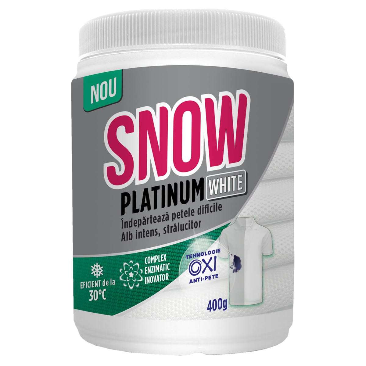 Snow Platinum White Pudra reprezinta o solutie performanta de indepartare a celor mai dificile pete de pe hainele albe, protejand totodata si tesatura. Datorita formulei inovatoare bazata pe un nou complex enzimatic, precum si tehnologiei Oxi Anti-pete, Snow Platinum Powder dizolva si indeparteaza chiar si cele mai dificile sau vechi pete (ulei, vin, ketchup, ciocolata, cafea, iarba, sange etc.). Snow Platinum Powder imbunatateste puterea de spalare a detergentului, curatand in profunzime petele, pentru rufe foarte curate, fara pete si impecabil de albe, inca de la prima spalare. Este sigur pentru tesaturi, deoarece nu contine clor. Este eficient chiar si la temperaturi joase (30°C), fiind potrivit atat pentru spalarea automata, cat si pentru cea manuala.Spalare automata: puneti mai intai detergentul (pudra sau lichid) in compartimentul dedicat, apoi adaugati o doza (30g) de Snow Platinum Pudra. Pentru haine foarte patate, folositi o doza dubla.Spalare manuala: adaugati o doza (30g) de Snow Platinum Pudra impreuna cu detergentul in 5l de apa si dizolvati bine. Lasati rufele la inmuiat pentru 60 de minute, apoi spalati si clatiti foarte bine. Pentru hainele foarte patate, se recomanda sa le lasati la inmuiat peste noapte. Nu expuneti rufele la soare decat daca au fost foarte bine clatite in prealabil.