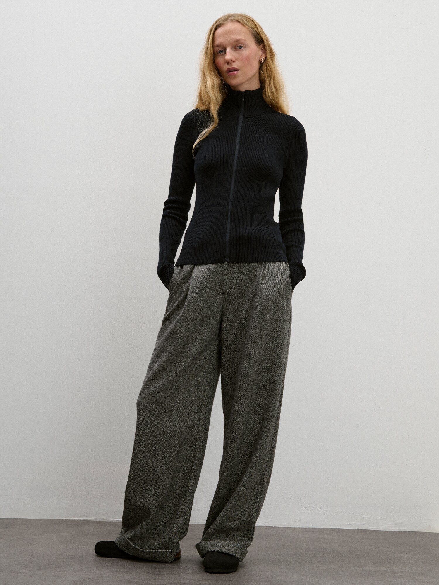 Design: Guler din tricot cu striații, Manșete cu striații; Tip de închidere: Fermoar; Material: Tricot; Decolteu: Guler tunică; Imprimeu: Monocrom; Detalii: Material structurat, Material moale; Croi: Croi mulat; Lungime mâneci: Mâncecă lungă; Lungime: Lungime normală