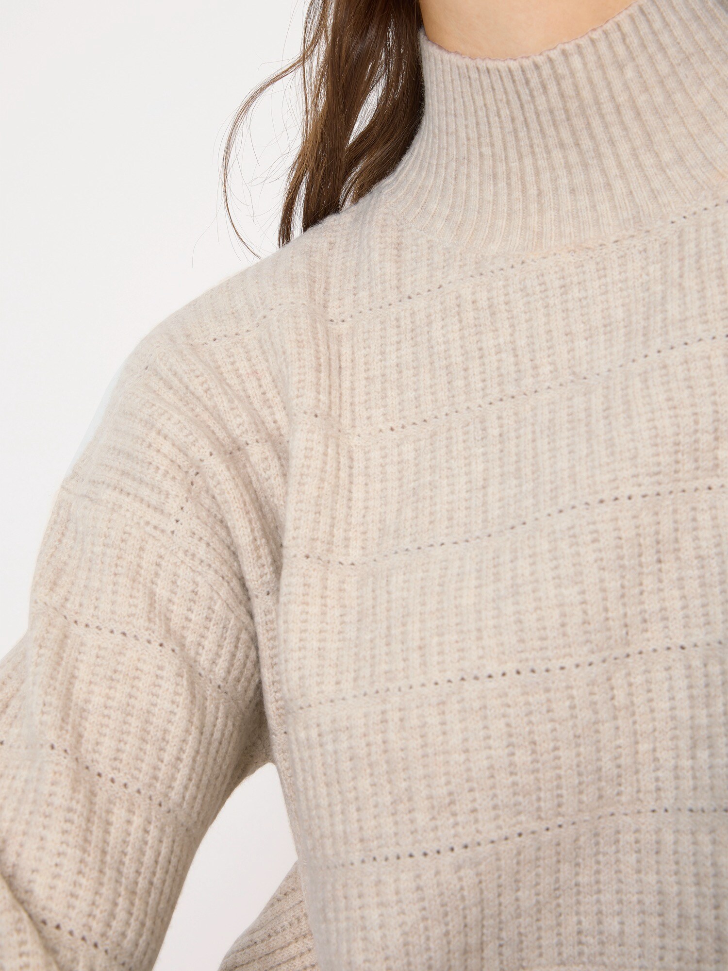 Design: Guler din tricot cu striații, Manșete cu striații; Material: Tricot; Decolteu: Guler tunică; Imprimeu: Monocrom; Detalii: Model cu găuri; Detalii: Fully fashioned, Material moale; Croi: Croi normal; Lungime mâneci: Mâncecă lungă; Lungime: Lungime normală