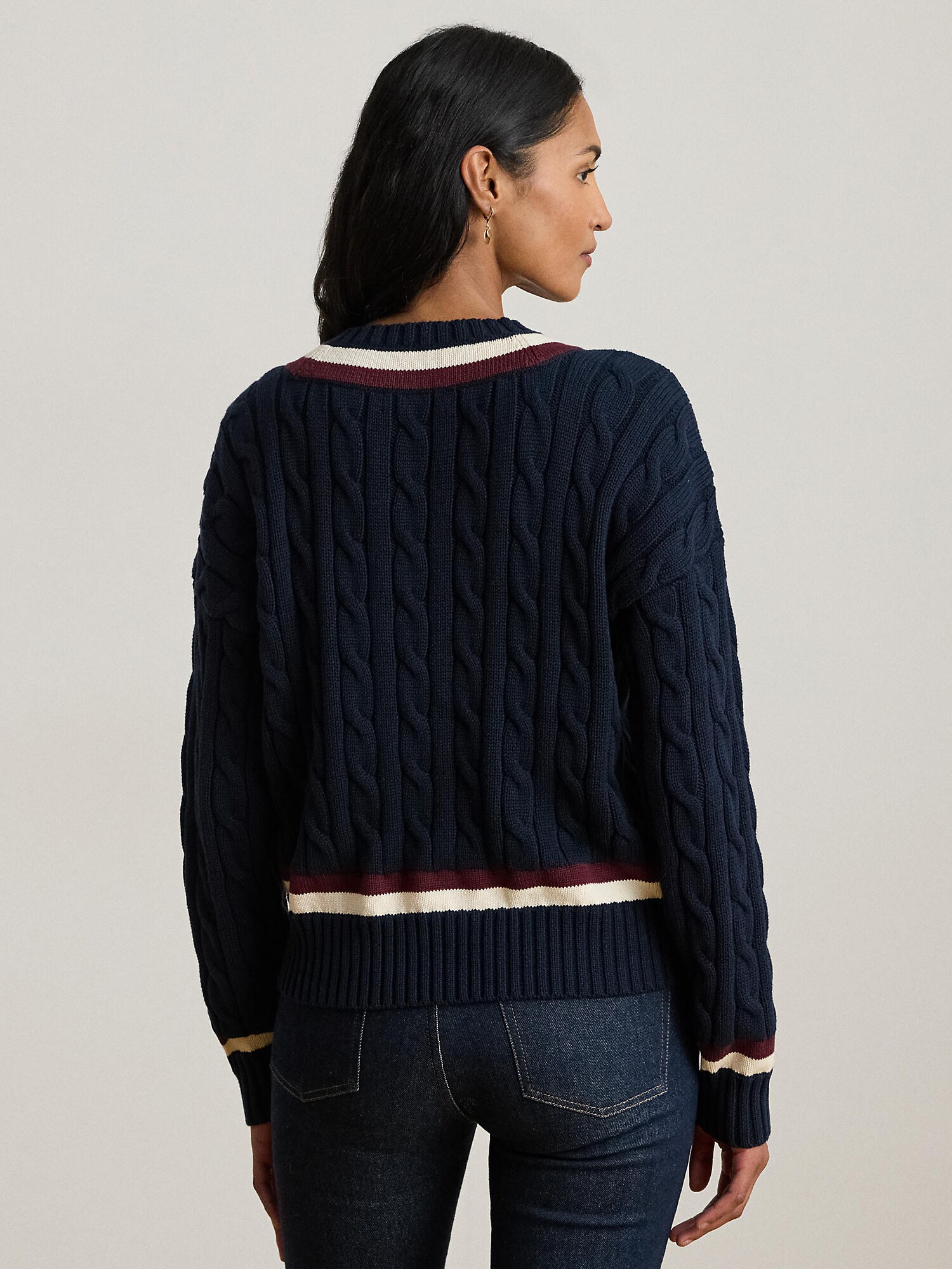 Design: Guler din tricot cu striații, Tiv drept, Manșete cu striații, Umăr întretăiat, Tricot torsadă; Material: Tricot; Decolteu: Decolteu în V; Imprimeu: Cu dungi; Detalii: Fully fashioned, Logo brodat, Material structurat, Material moale; Croi: Croi lejer; Lungime mâneci: Mâncecă lungă; Lungime: Lungime normală