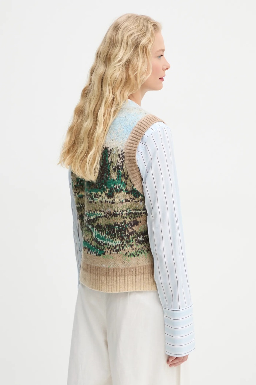 Vesta din colecția MUNTHE confecționat din tricot ornamentat. Lâna, datorită proprietăților sale termoregulatoare ridicate, ajută la menținerea căldurii atunci când este frig și la răcire atunci când este cald.