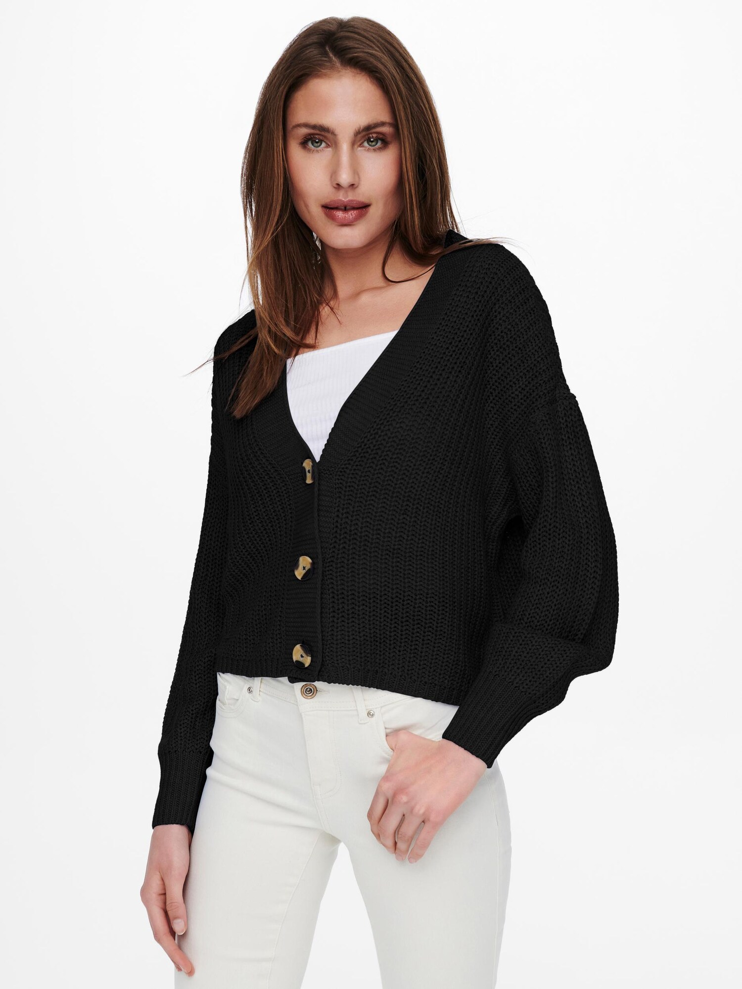 Design: Șir de nasturi, Manșete cu striații, Umăr întretăiat; Tip de închidere: Închidere cu nasturi; Material: Tricot; Decolteu: Decolteu în V; Imprimeu: Monocrom; Detalii: Material structurat, Material moale; Croi: Croi lejer; Lungime mâneci: Mâncecă lungă; Lungime: Lungime normală