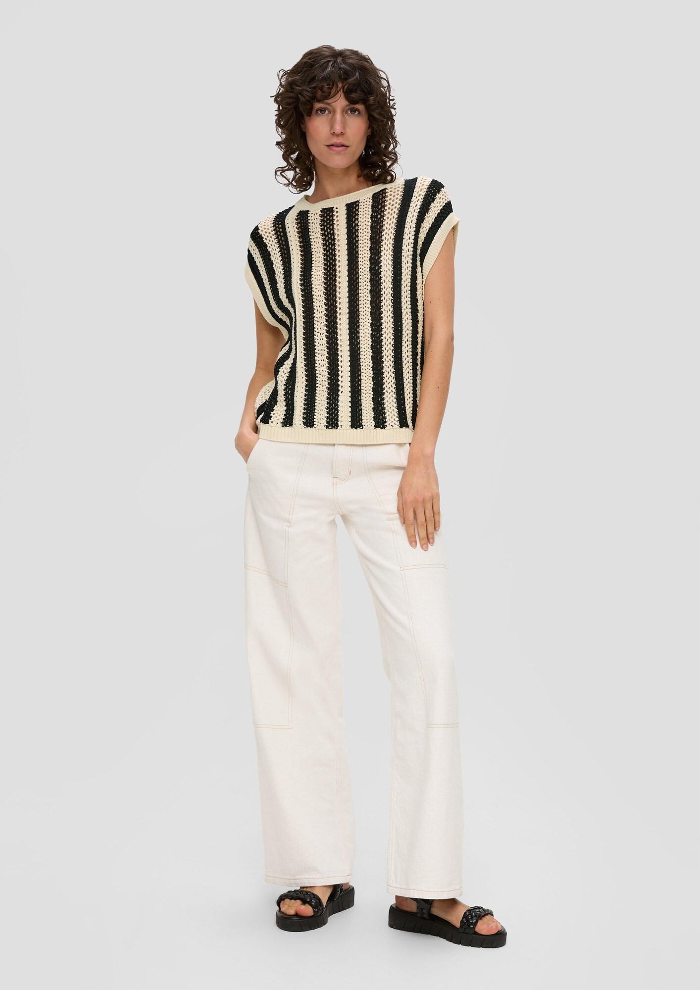 Îmbracă-te cu stil și confort în puloverul elegant s.Oliver, o piesă versatilă care îmbină perfect confortul cu rafinamentul. Cu un design cu tiv drept și un decolteu rotund, acest pulover confecționat dintr-un material tricotat moale te va face să te simți bine în orice moment al zilei. Imprimeul cu dungi adaugă o notă de personalitate vestimentației tale, iar croiul lejer permite o libertate de mișcare ideală. Fără mâneci și cu o lungime normală, acest pulover este perfect pentru zilele relaxante sau pentru a-l purta în straturi sub o haină chic. Transformă-ți garderoba cu acest pulover rafinat și fă-ți zilele mai stilate! Nu rata ocazia de a-l adăuga la colecția ta acum!