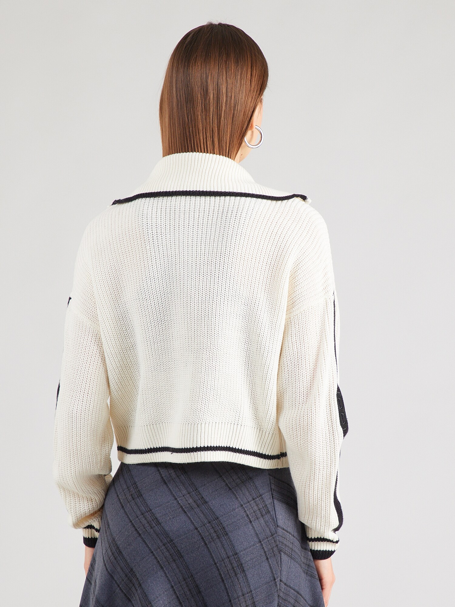 Design: Guler din tricot cu striații, Tiv drept, Manșete cu striații, Umăr întretăiat, Detalii în culori contrastante; Tip de închidere: Fermoar; Material: Tricot; Decolteu: Guler tunică; Imprimeu: Monocrom; Detalii: Fully fashioned, Material structurat, Material moale; Croi: Croi normal; Lungime mâneci: Mâncecă lungă; Lungime: Lungime normală