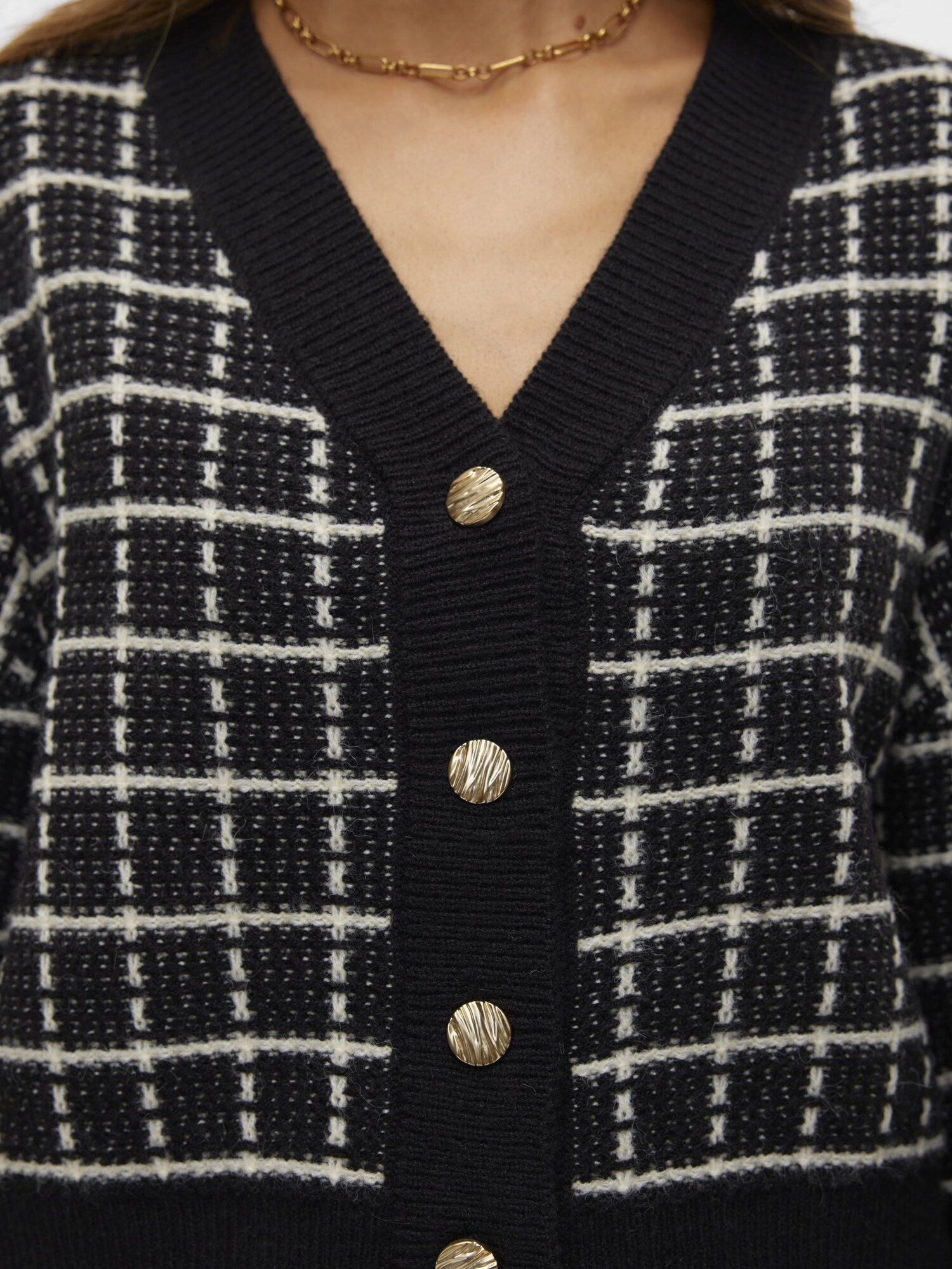 Îmbracă-te cu stil și confort în geaca tricotată VERO MODA VMKIA, un must-have în garderoba ta! Această piesă versatilă, în nuanțele elegante de negru și alb, îți va transforma fiecare ținută într-o declarație de modă. Cu manșete cu striații și un umăr întretăiat, această geacă adaugă un aer chic și modern, perfect pentru orice ocazie. Decolteul în V subliniază frumusețea siluetei tale, iar imprimeul în carouri îți va scoate în evidență stilul unic. Realizată dintr-un material tricotat de calitate, cu un croi lejer și mânceci lungi, te va ține cald și confortabil fără a compromite eleganța. Nu rata ocazia de a adăuga această geacă impresionantă în dulapul tău și fii pregătită să întorci priviri admirative! Comandă acum și redefinește-ți stilul!