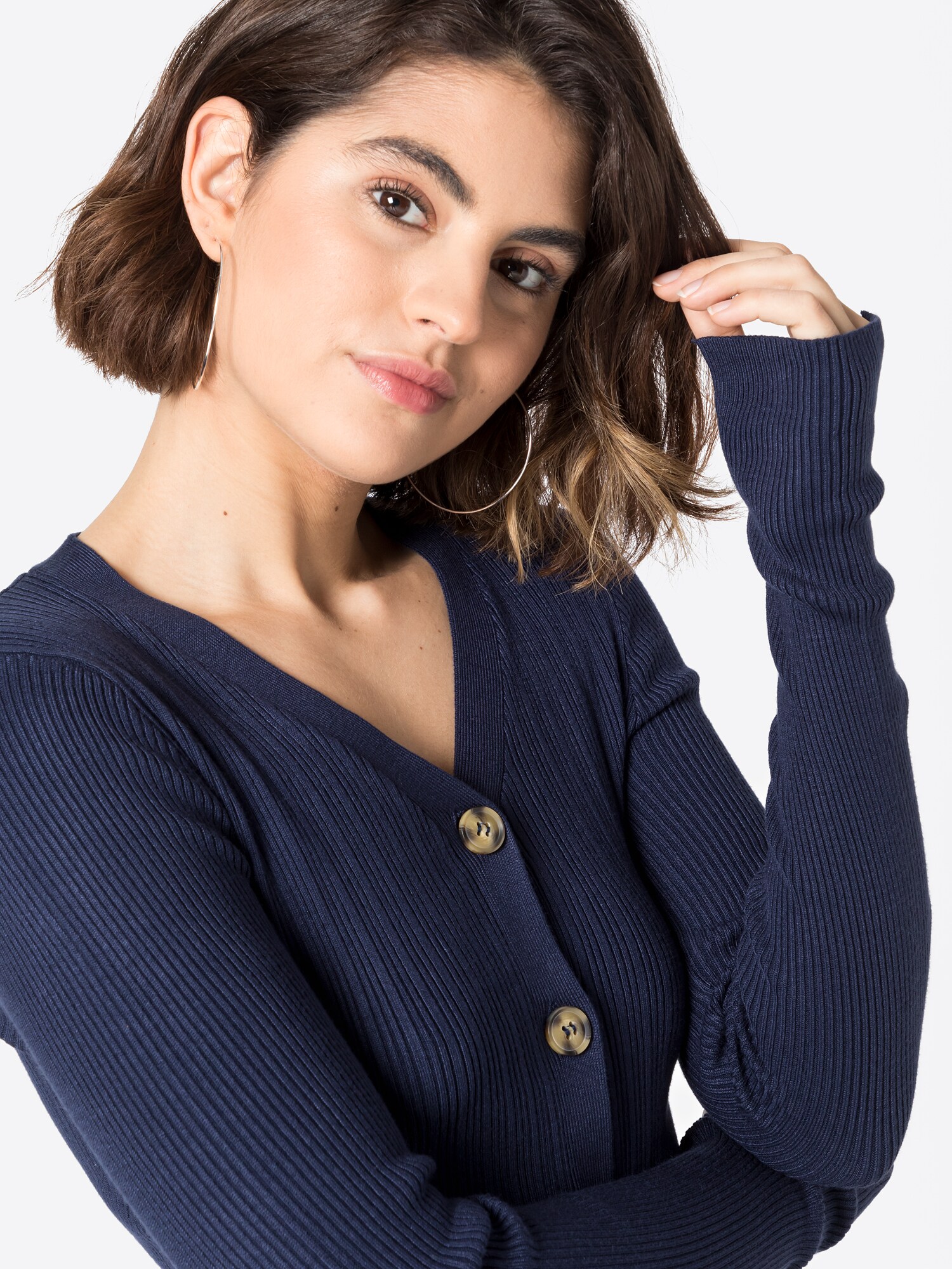 Design: Guler din tricot cu striații, Tiv drept; Tip de închidere: Închidere cu nasturi; Material: Viscoză; Decolteu: Decolteu în V; Imprimeu: Monocrom; Detalii: Fully fashioned, Material structurat; Croi: Croi mulat; Lungime mâneci: Mâncecă lungă; Lungime: Croi scurt
