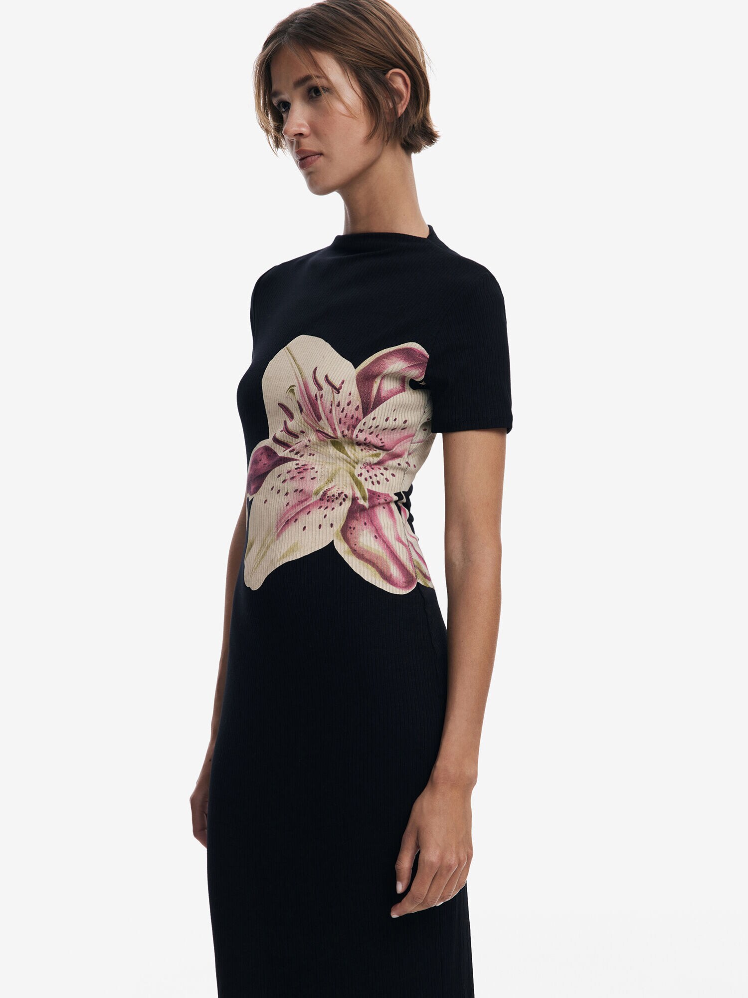 Design: Tiv/ margine tighelită; Material: Viscoză; Decolteu: Decolteu rotund; Imprimeu: Cu imprimeu floral; Detalii: Cusături ton în ton, Material structurat; Lungimea: Lungime 3/4; Croi: Croi mulat; Lungime mâneci: Mâneci scurte