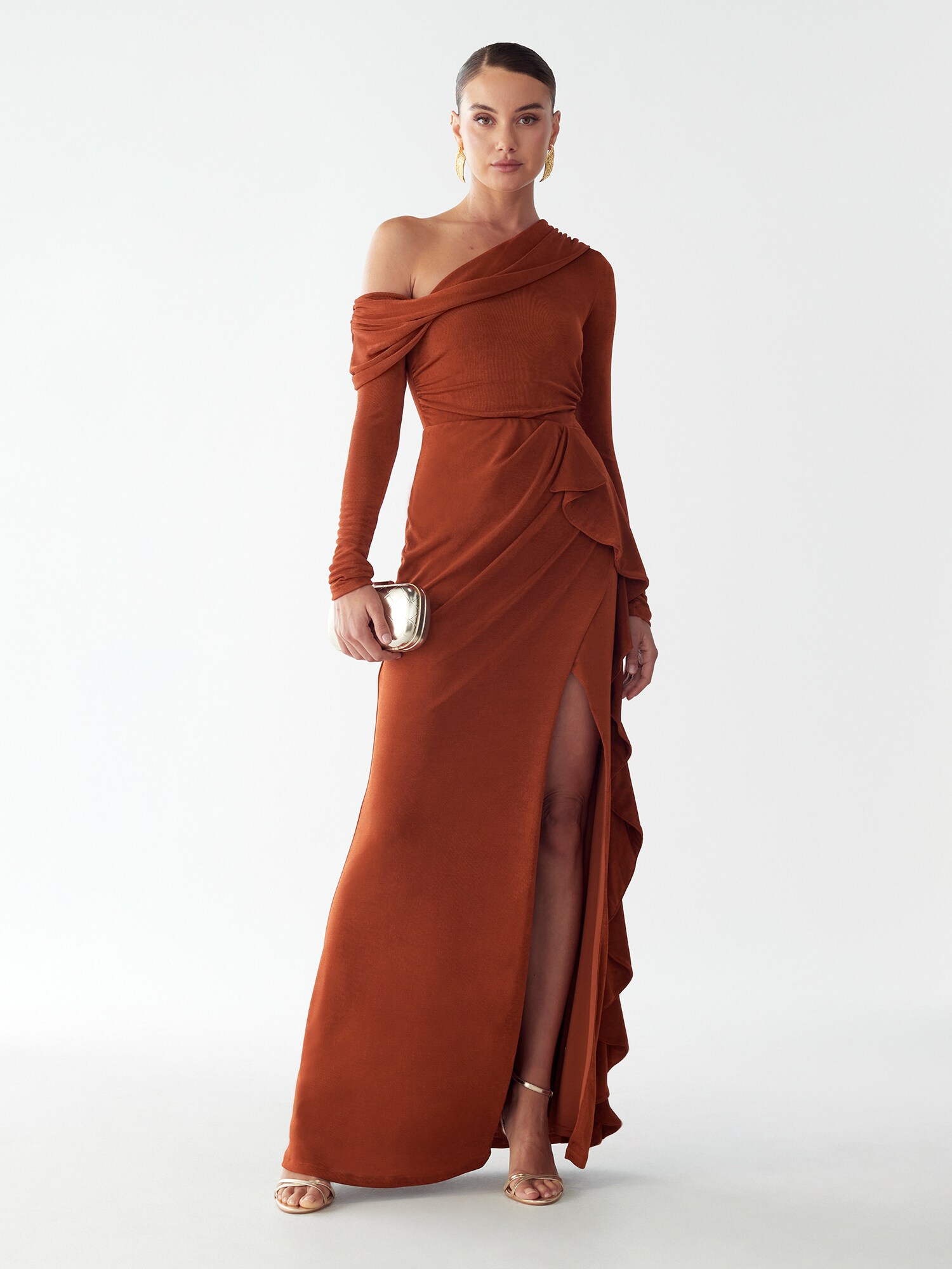 Imprimeu: Monocrom; Tipul de susținere: Pe un umăr; Detalii: Pliuri, Drapat; Lungimea: Lung/maxi; Croi: Croi normal; Lungime mâneci: Mâncecă lungă