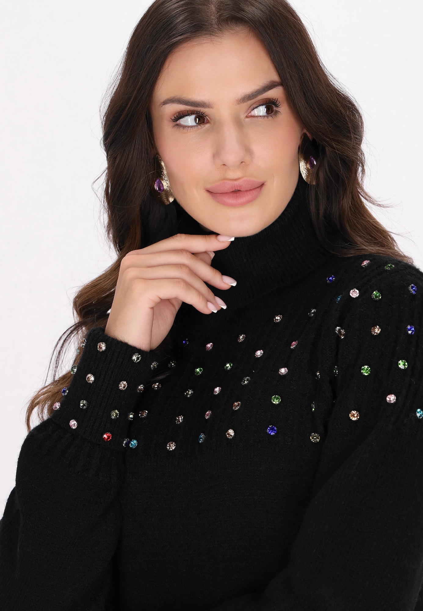 Design: Guler din tricot cu striații, Manșete cu striații; Material: Tricot; Decolteu: Helancă; Imprimeu: Monocrom; Detalii: Pietre decorative; Detalii: Cu ștrasuri, Fully fashioned; Lungimea: Scurt/mini; Croi: Drept; Croi: Croi normal; Lungime mâneci: Mâncecă lungă