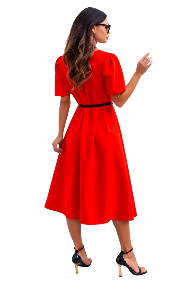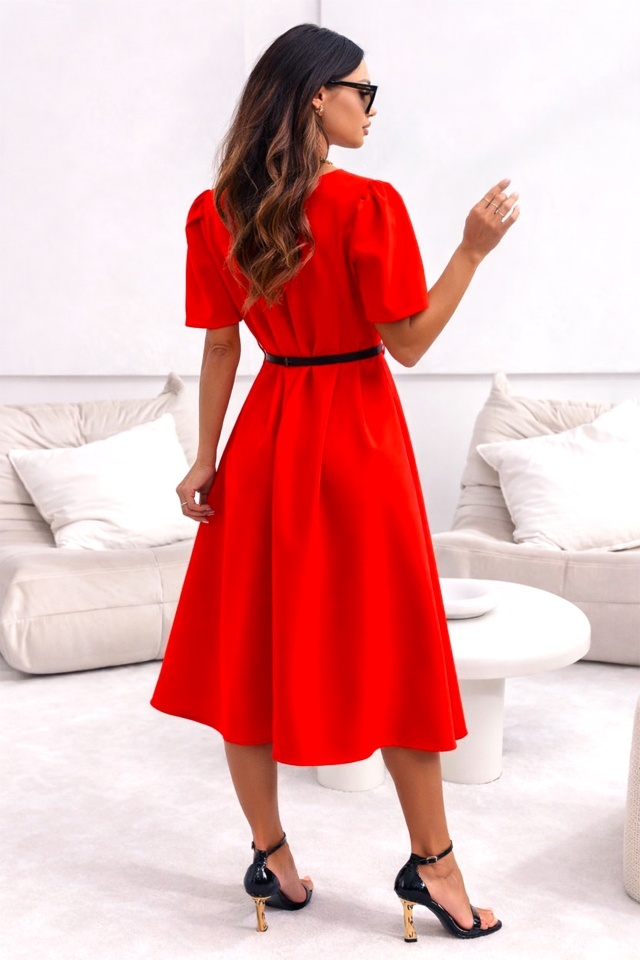 Rochie office ZALIA, croi bufant si curea subtire, Rosu, Marimea S/M