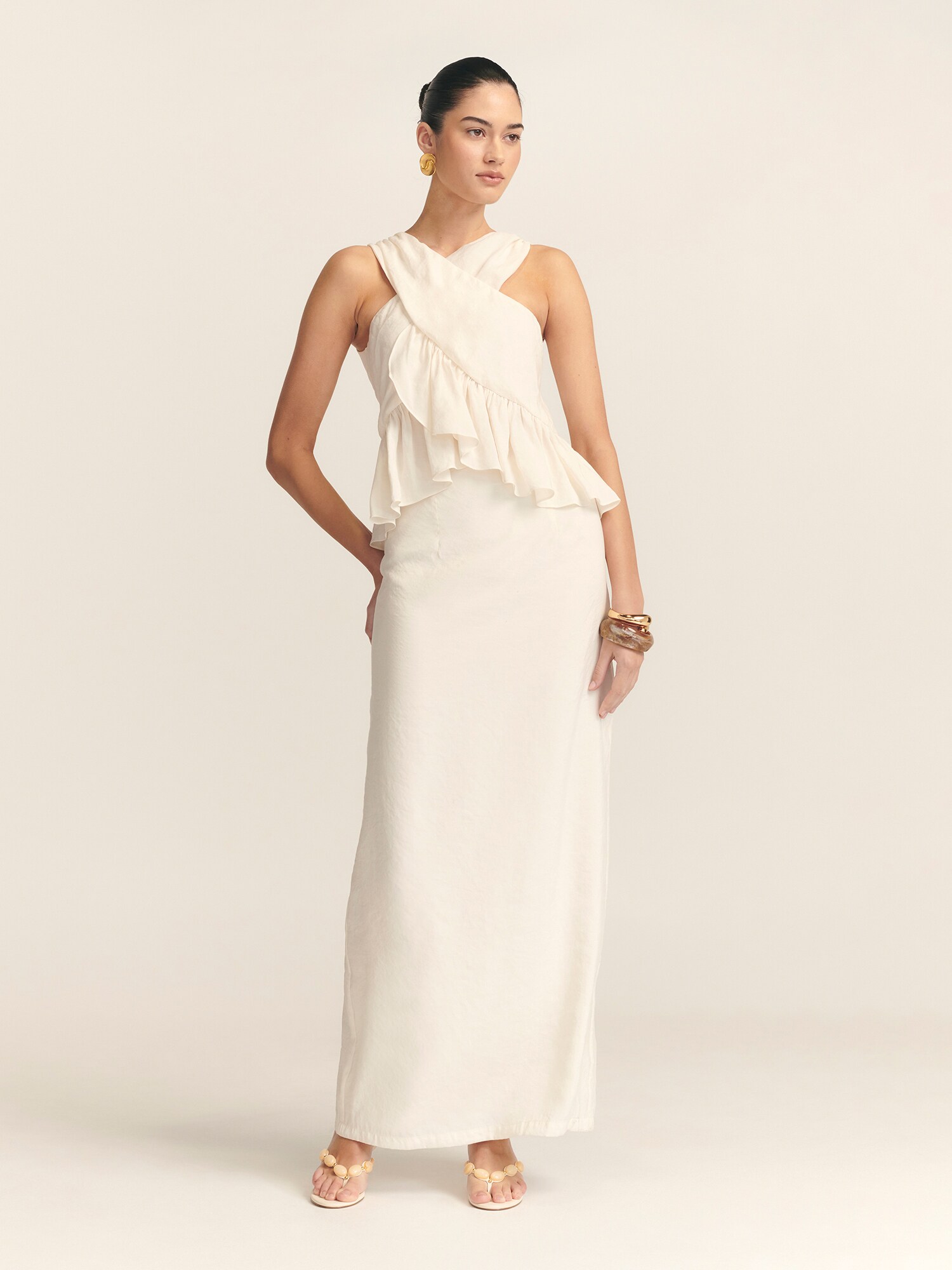 Imprimeu: Monocrom; Detalii: Volane; Detalii: Cusături ton în ton; Lungimea: Lung/maxi; Croi: Cambrat; Croi: Croi mulat; Lungime mâneci: Fără mâneci
