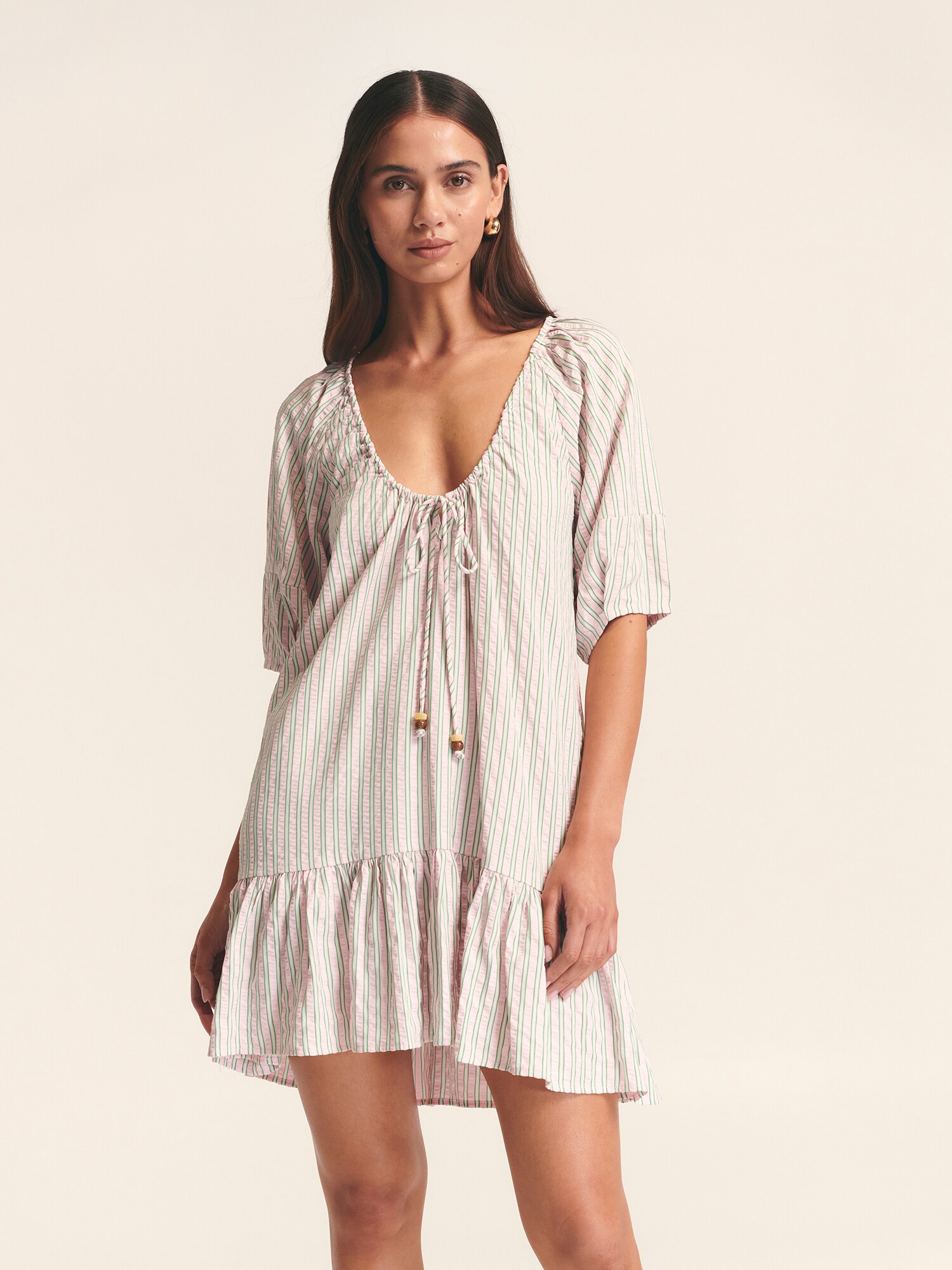 Design: Închidere lacrimă, Cu bandă/ șiret; Tip de închidere: Închidere cu nasturi; Material: Bumbac; Decolteu: Decolteu în V; Imprimeu: Cu dungi; Detalii: Volane, Drapat; Detalii: Imprimat în totalitate; Lungimea: Scurt/mini; Croi: Croi lejer; Lungime mâneci: Mâneci medii