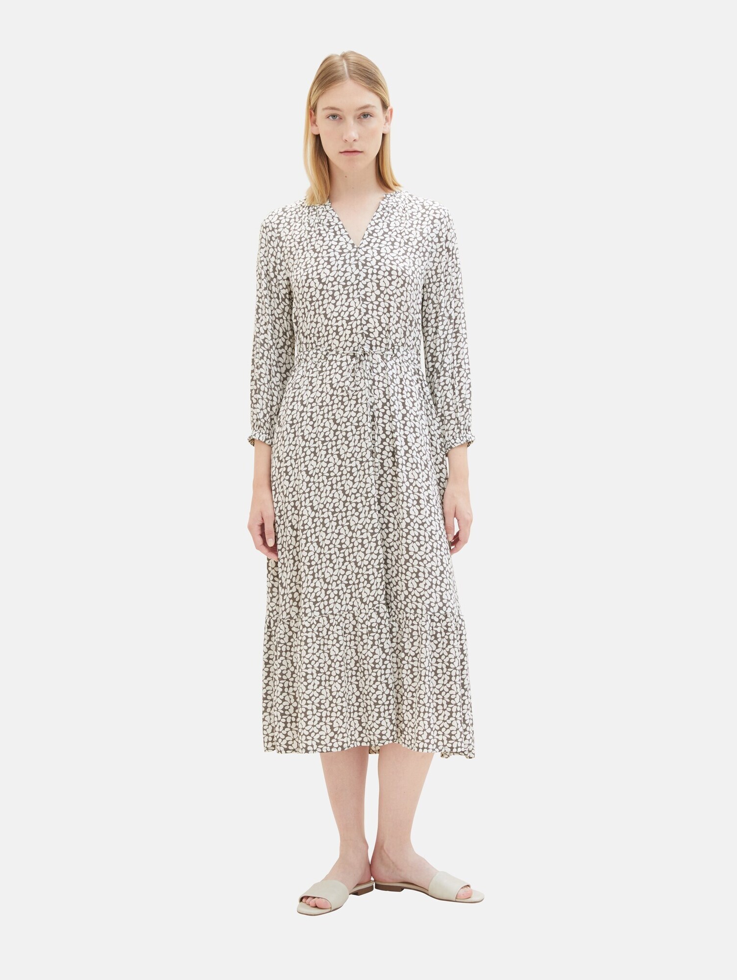 Design: Tiv/ margine tighelită, Tiv drept, Cu nod/ benzi; Material: Viscoză; Decolteu: Decolteu tăiat; Imprimeu: Cu imprimeu floral; Guler de cămașă: Decolteu tunică; Detalii: Volane, Drapat; Detalii: Cordon talie, Imprimat în totalitate, Material curgător, Material răcoros; Lungimea: Lungime 3/4; Croi: Croi lejer; Lungime mâneci: Mâneca trei sferturi