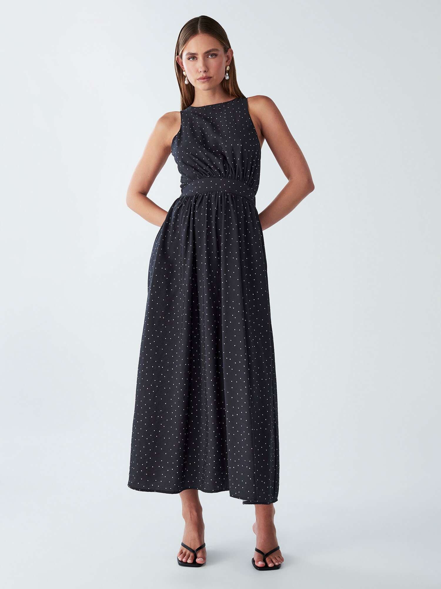 Design: Cu nod/ benzi, Buzunare laterale deschise; Material: Bumbac; Decolteu: Cu spatele gol; Imprimeu: Cu buline; Tipul de susținere: Bretele normale; Detalii: Cu decupaje, Drapat; Detalii: Imprimat în totalitate, Material răcoros; Lungimea: Lungime 7/8; Croi: Cambrat; Croi: Croi normal; Lungime mâneci: Fără mâneci