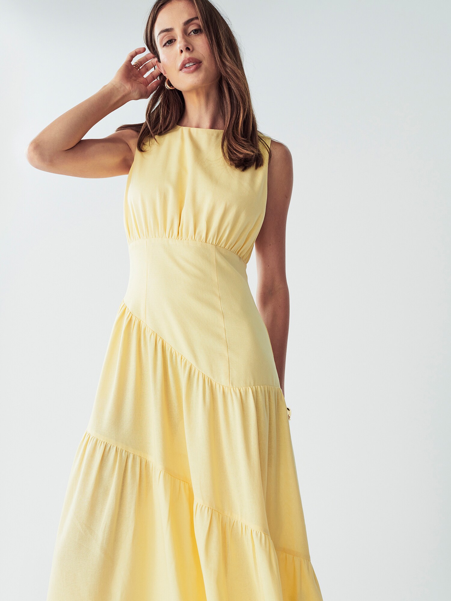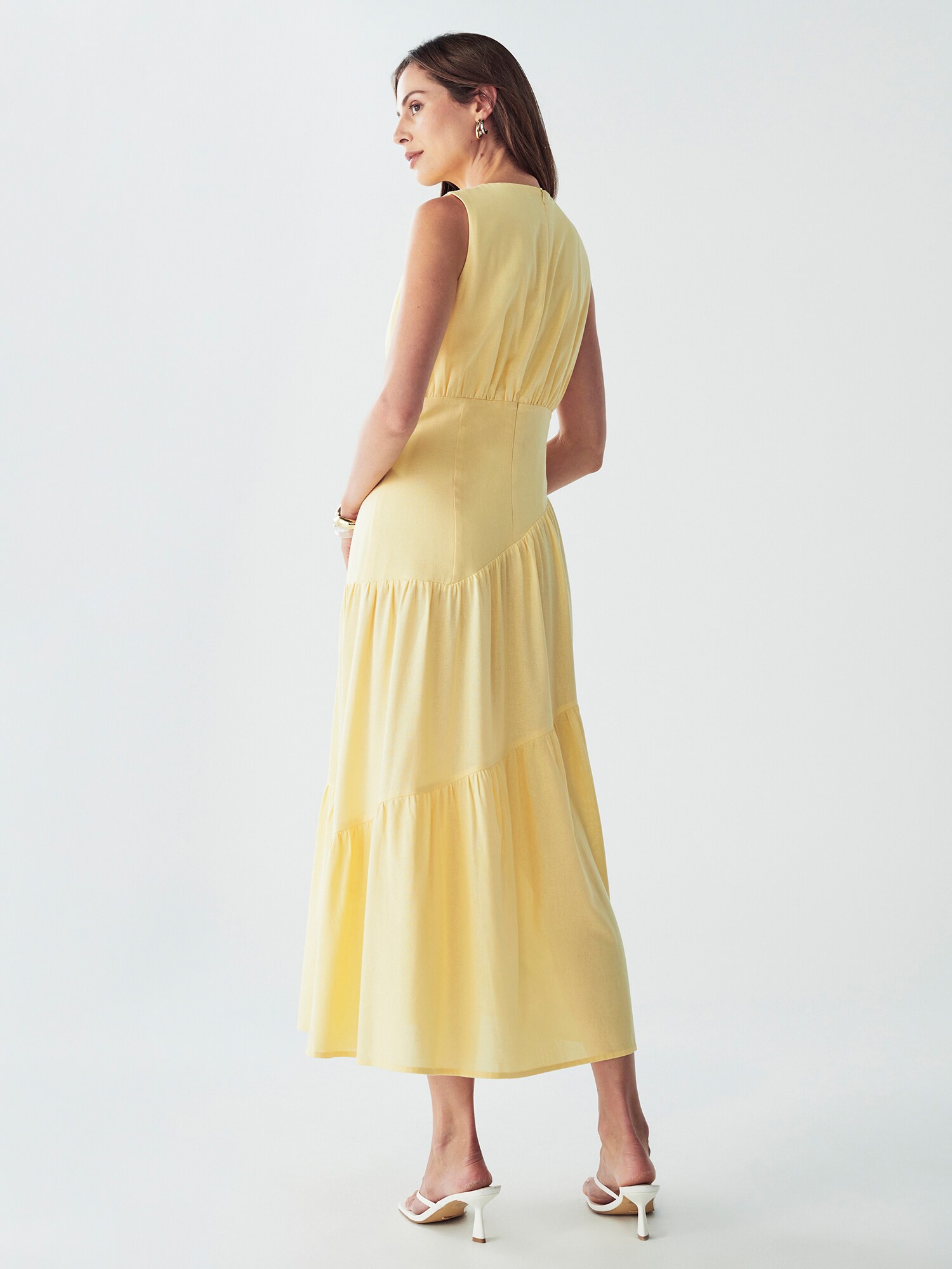 Design: Tiv/ margine tighelită; Tip de închidere: Fermoar; Material: In; Decolteu: Decolteu rotund; Imprimeu: Monocrom; Tipul de susținere: Bretele late; Detalii: Volane, Drapat; Detalii: Cusături ton în ton; Lungimea: Lungime 7/8; Croi: La vedere; Croi: Croi normal; Lungime mâneci: Fără mâneci