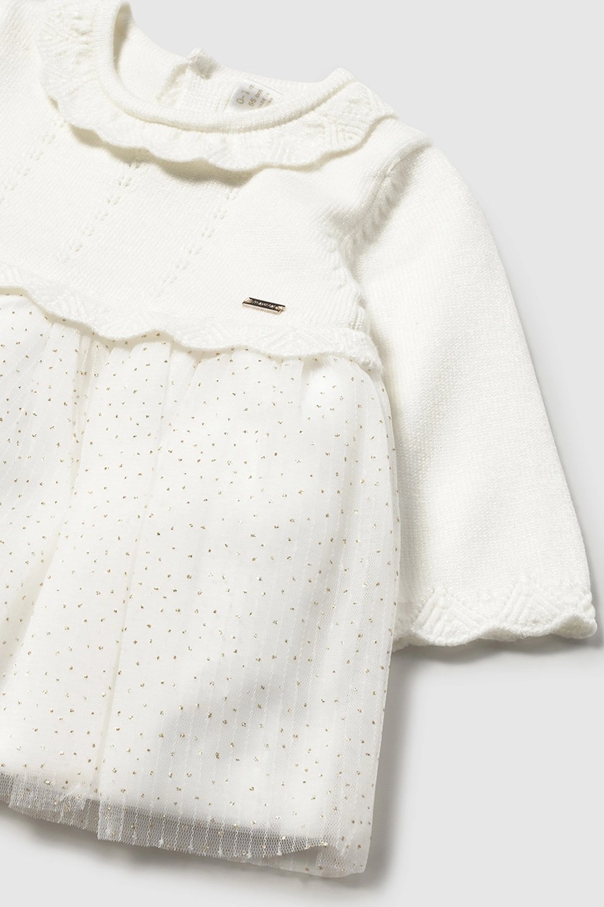 Rochie bebe din colecția Mayoral Newborn. Model in clos confecționat dintr-o combinație de două materiale diferite.