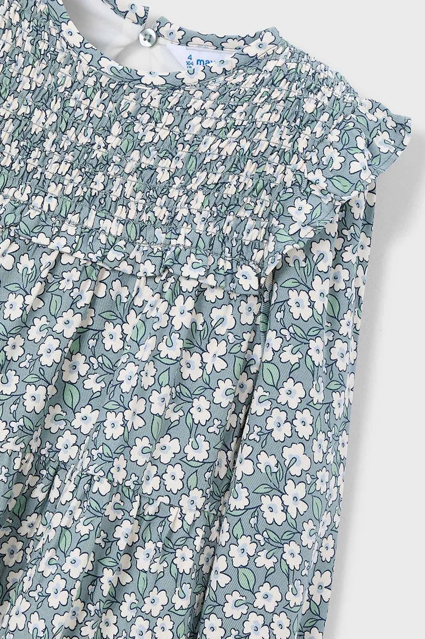 Rochie pentru copii din colecția Mayoral. Model in clos confecționat din țesătură ornamentată.