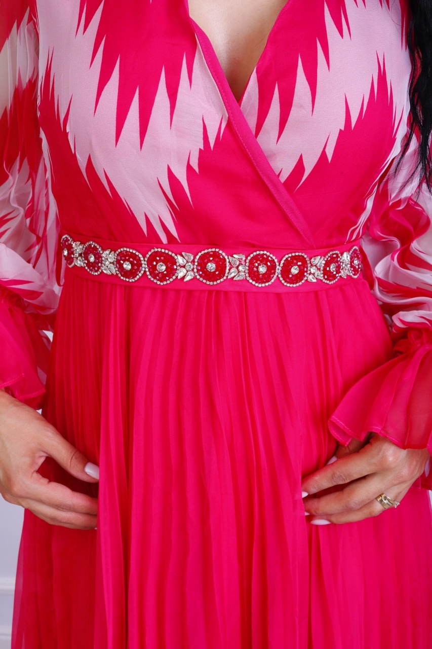 Rochie damă elegantă „Romina” – roz O rochie sofisticată de seară, ideală pentru evenimente formale și ocazii speciale: Culoare : roz profund, clasic și versatil. Croială : siluetă tip cambrată, ușor evazată în partea de jos pentru mișcare fluidă. Decolteu : în V savant, ce evidențiază umerii și zona gâtului. Mâneci : lungi, fixate la încheietură, oferind un aer elegant, dar modern. Stil & Ocazii recomandate : Ideală pentru petreceri elegante, cine festive, invitații la nuntă sau evenimente corporate. Designul minimalist și coloritul neutru permit accesorizarea cu bijuterii statement sau o pereche de sandale fine pentru un look complet.