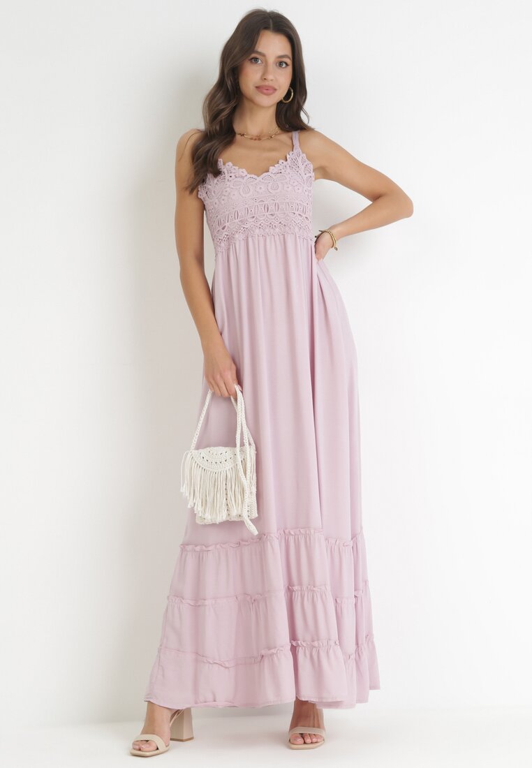 Rochie Roză Maxi cu Bretele cu Inserții de Dantelă și Volane Lemera