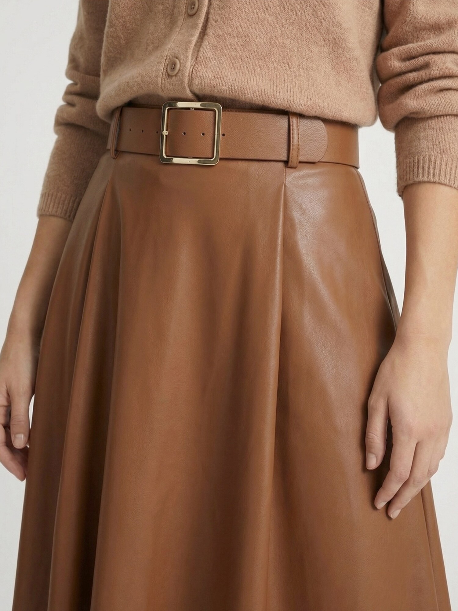 Design: Tiv drept, Curea în talie; Tip de închidere: Fermoar; Material: Imitație de piele; Imprimeu: Monocrom; Forma fustei: În formă de A; Detalii: Material neted, Găici pentru curea; Lungimea: Lungime 3/4; Croi: Croi normal