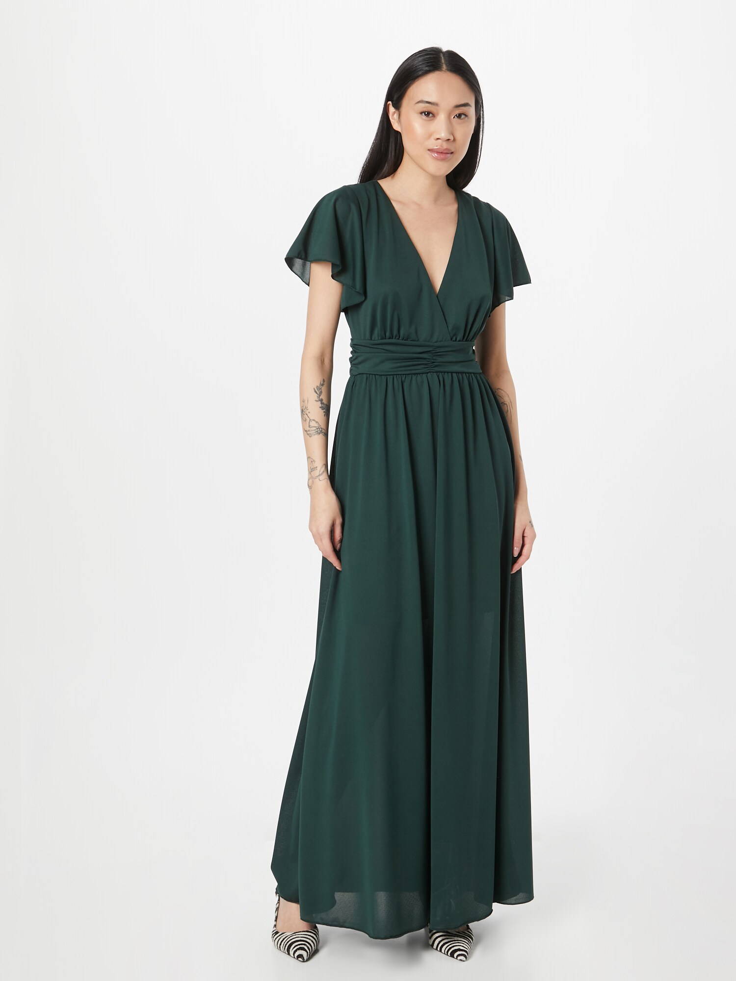 Design: Tiv/ margine tighelită, Croi care avantajează silueta, Fermoar spate, Decolteu adânc; Tip de închidere: Fermoar; Decolteu: Decolteu în V; Imprimeu: Monocrom; Detalii: Volane, Drapat; Detalii: Cusături ton în ton, Material ușor; Lungimea: Lung/maxi; Croi: Cambrat; Croi: Croi normal; Lungime mâneci: Mâneci scurte