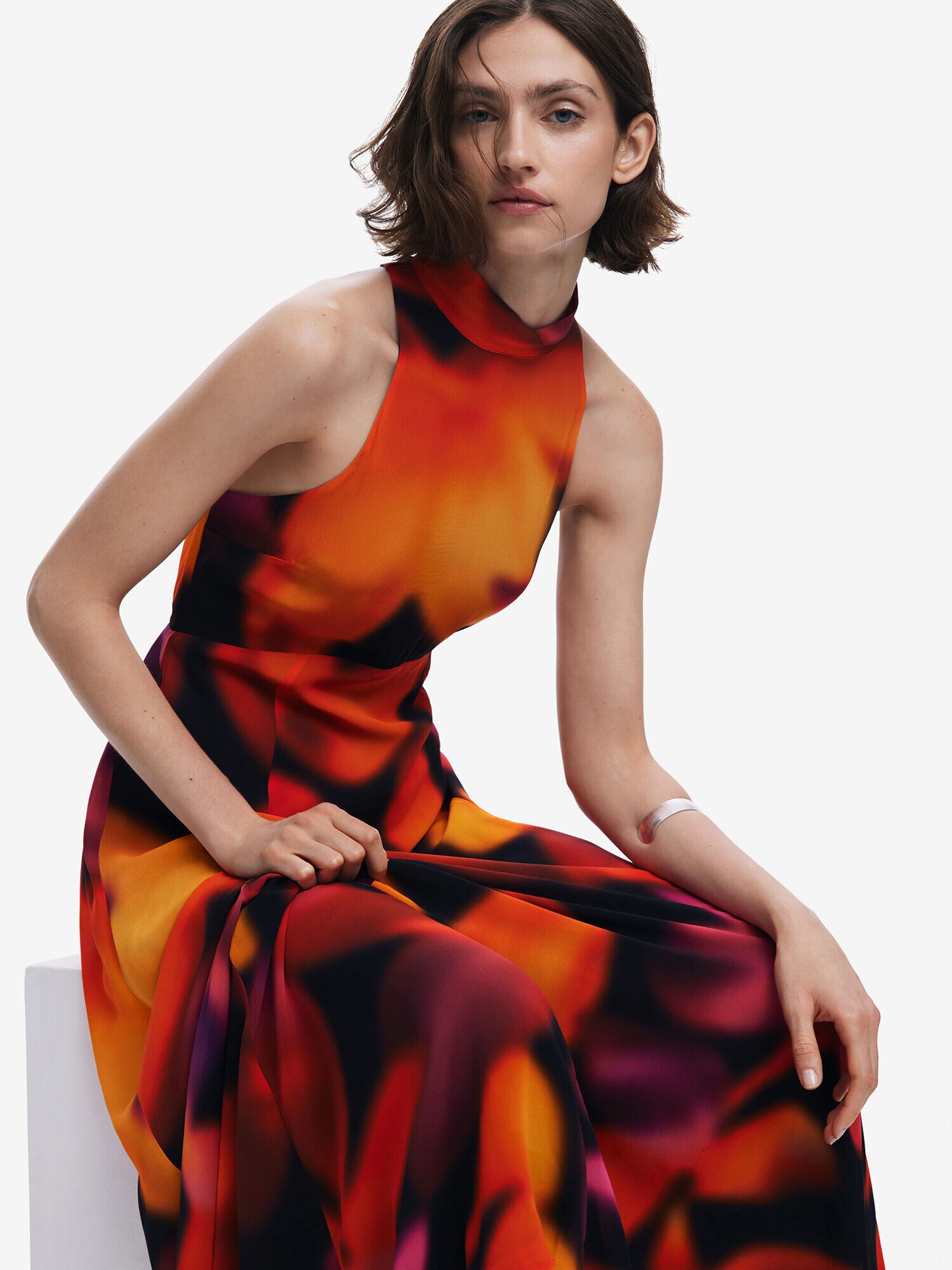 Design: Tiv/ margine tighelită; Tip de închidere: Închidere cu nasturi; Material: Viscoză; Decolteu: Guler tunică; Imprimeu: Cu imprimeu floral; Detalii: Cu decupaje, Drapat; Detalii: Imprimat în totalitate; Lungimea: Lung/maxi; Croi: Cambrat; Croi: Croi normal; Lungime mâneci: Fără mâneci