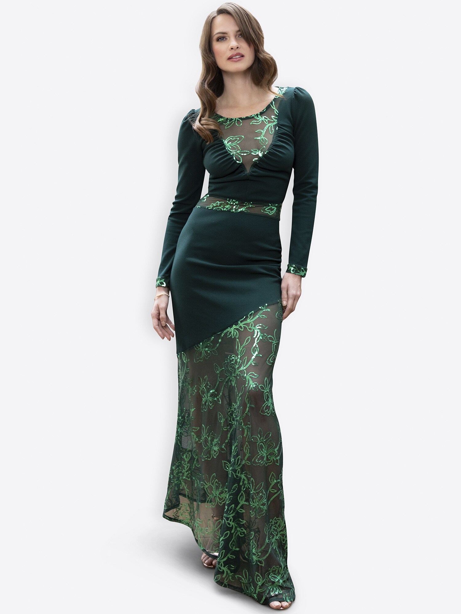 Design: Manșete rotunjite, Tiv asimetric, Slip interior cu plasă; Tip de închidere: Fermoar; Decolteu: Decolteu în V; Imprimeu: Cu imprimeu floral; Tipul de susținere: Bretele normale; Detalii: Paiete, Broderie; Lungimea: Lung/maxi; Croi: Croi normal; Lungime mâneci: Mâncecă lungă