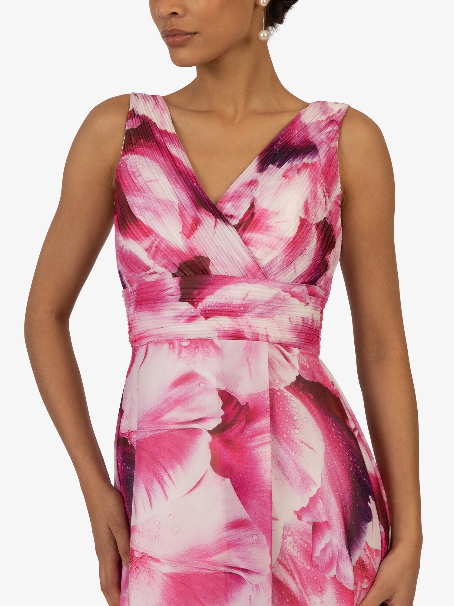 Design: Tiv/ margine tighelită; Tip de închidere: Fermoar; Decolteu: Decolteu în V; Imprimeu: Cu imprimeu floral; Tipul de susținere: Bretele normale; Detalii: Drapat, Design petrecut; Detalii: Imprimat în totalitate; Lungimea: Lung/maxi; Croi: Cambrat; Croi: Croi normal; Lungime mâneci: Fără mâneci