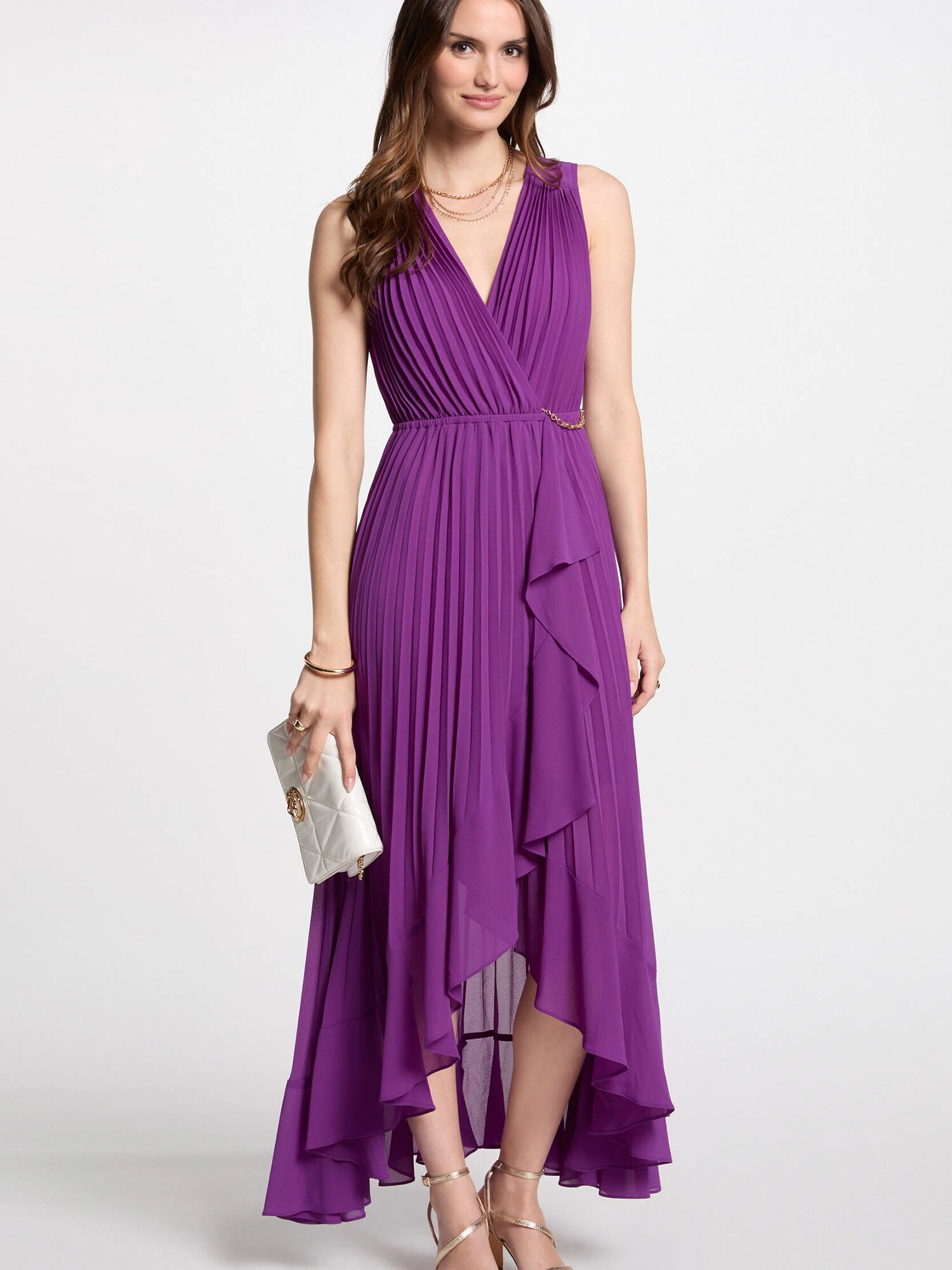 Design: Tiv/ margine tighelită, Tiv asimetric, Decolteu adânc, Model petrecut; Decolteu: Cache-Coeur; Imprimeu: Monocrom; Tipul de susținere: Bretele late; Detalii: Volane, Drapat, Pliseu; Detalii: Cusături ton în ton, Material curgător; Lungimea: Lung/maxi; Croi: Cambrat; Croi: Croi normal; Lungime mâneci: Fără mâneci