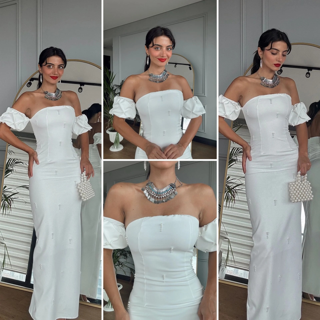 Rochie Alba Elegantă Lunga cu Umeri Goi și Aplicații Perlate