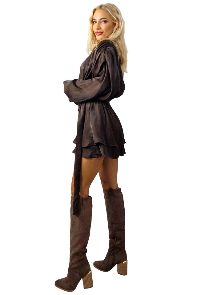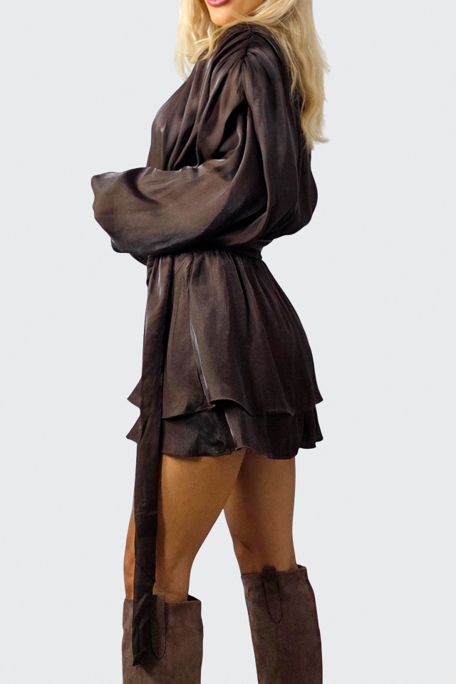 Rochie evenimente de zi StardeLLe, cu efect lucios si volane, Maro, Marimea S/M