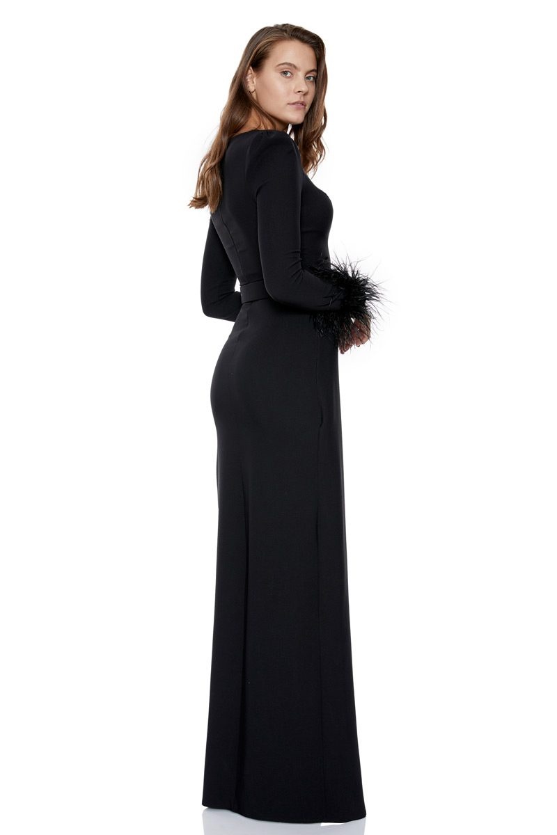 Rochie elegantă neagră cu detalii din pene la mâneci, creată pentru a pune în valoare feminitatea și stilul. Croiala cambrată evidențiază talia și subliniază armonios silueta, în timp ce mânecele lungi decorate cu pene la încheieturi adaugă volum și un efect spectaculos. Zona bustului este îmbogățită cu aplicații delicate, oferind un punct de atracție vizual, iar decolteul în V discret echilibrează perfect întregul design. Rochia are o lungime elegantă și practică, fiind prevăzută cu fermoar la spate pentru o închidere confortabilă și sigură. Confecționată dintr-un material de calitate, cu textură ușor lucioasă și căptușeală fină, această piesă oferă un plus de confort la purtare. Ideală pentru nunți, petreceri de seară, baluri sau evenimente speciale , rochia impresionează prin detaliile sofisticate și aerul festiv dat de penele elegante.