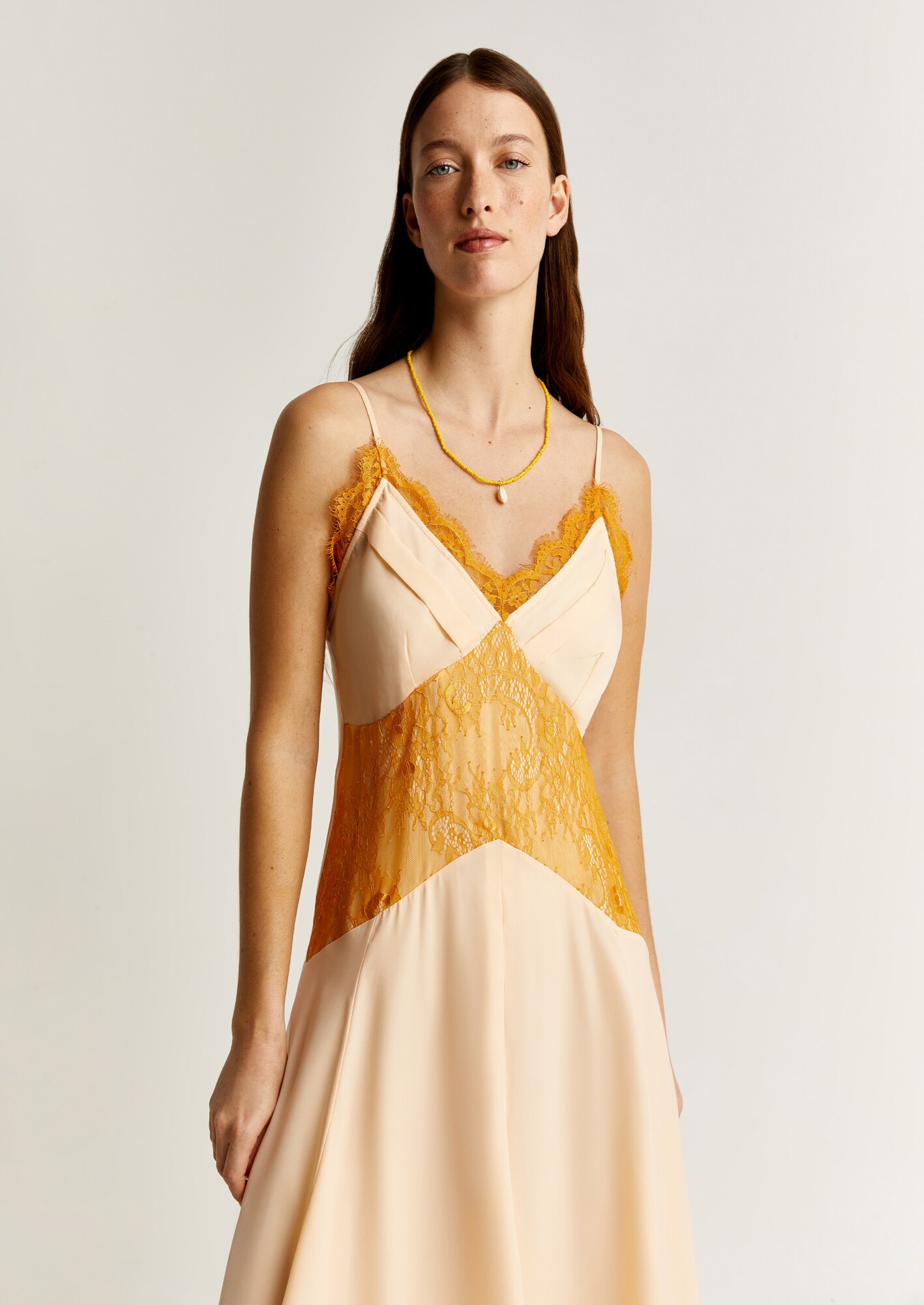 Design: Tiv/ margine tighelită, Cu spatele gol; Tip de închidere: Fermoar; Material: Satin; Decolteu: Decolteu în V; Imprimeu: Color-blocking; Tipul de susținere: Bretele subțiri; Detalii: Dantelă, Pliuri; Detalii: Cusături ton în ton, Material curgător; Lungimea: Lungime 7/8; Croi: Croi normal; Lungime mâneci: Fără mâneci