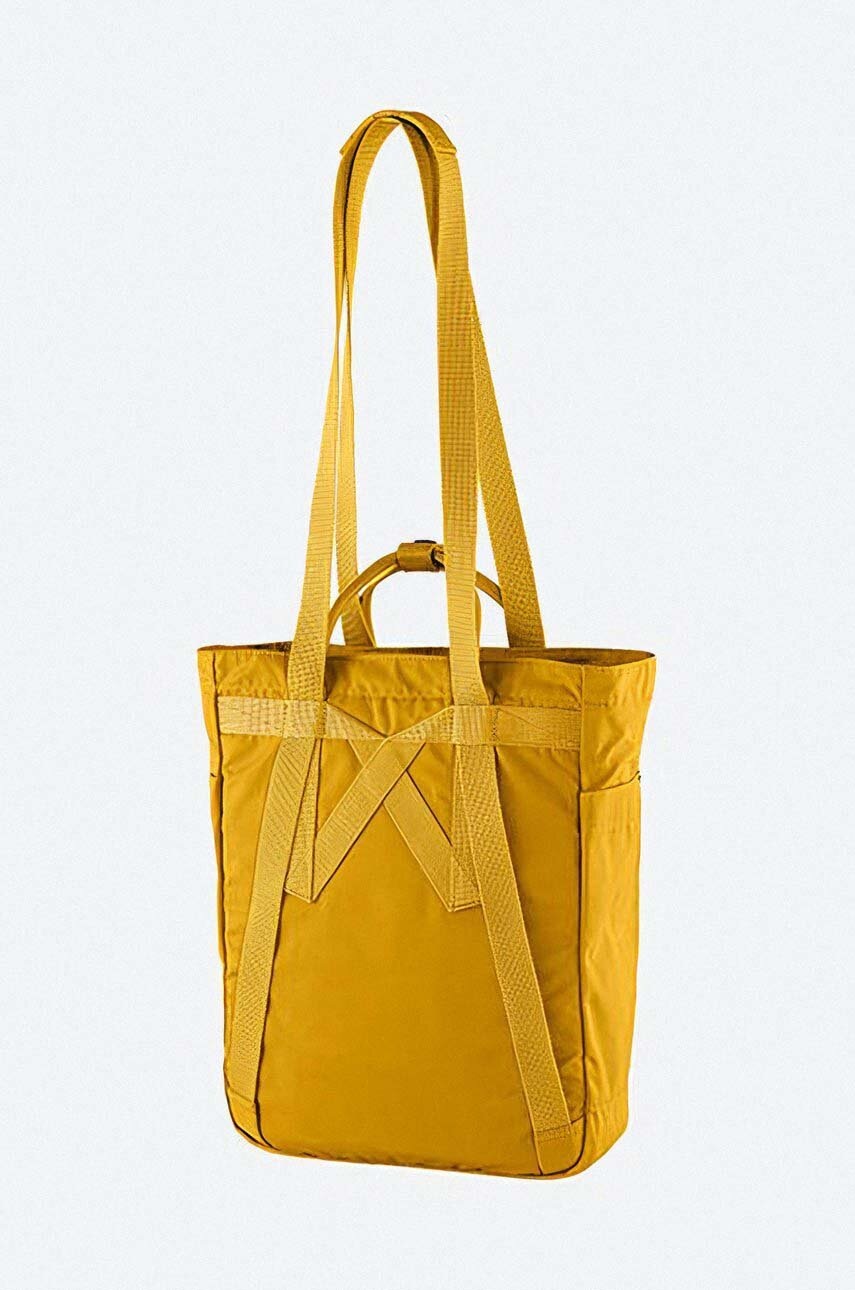 Fjallraven rucsac galben din fibre reciclate, 1 compartiment, buzunar frontal cu fermoar, poate fi purtat ca geantă, dimensiuni 36 x 30 x 15 cm