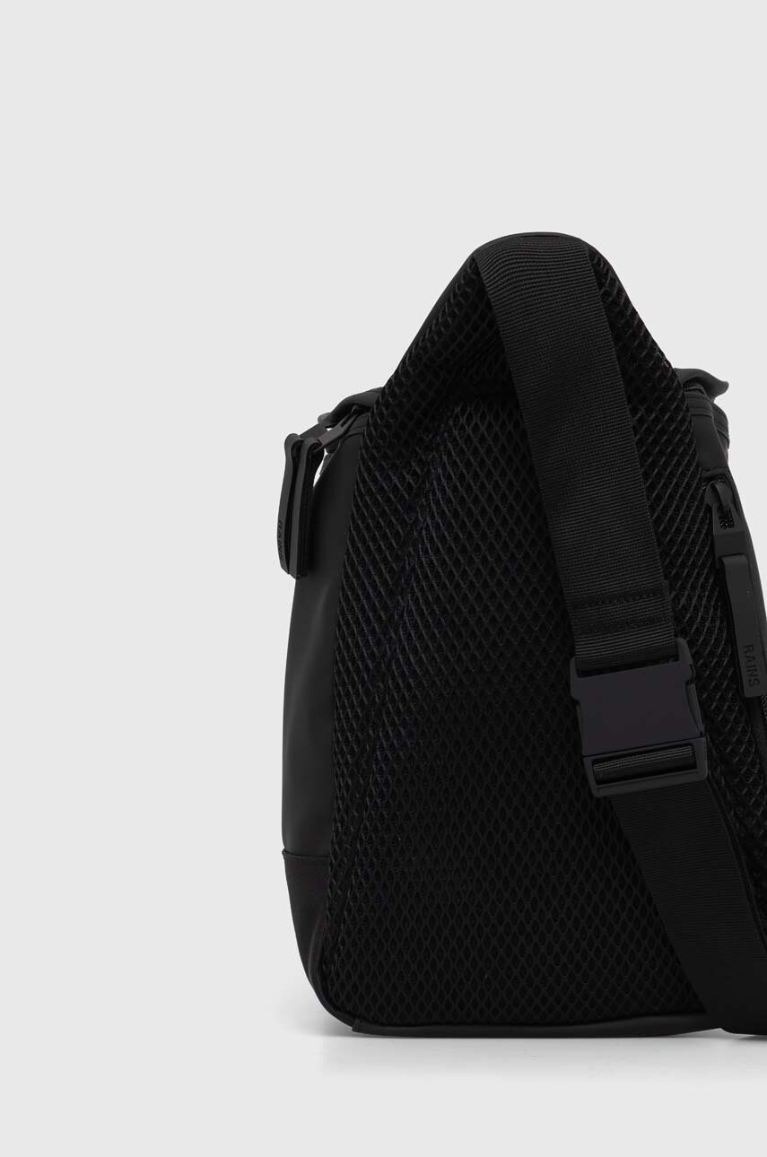 Rains rucsac mic, culoare negru, căptușit, închidere cu fermoar, curea reglabilă nedetasabilă, buzunar cu fermoar pe spate, dimensiuni 29x20x10,5 cm