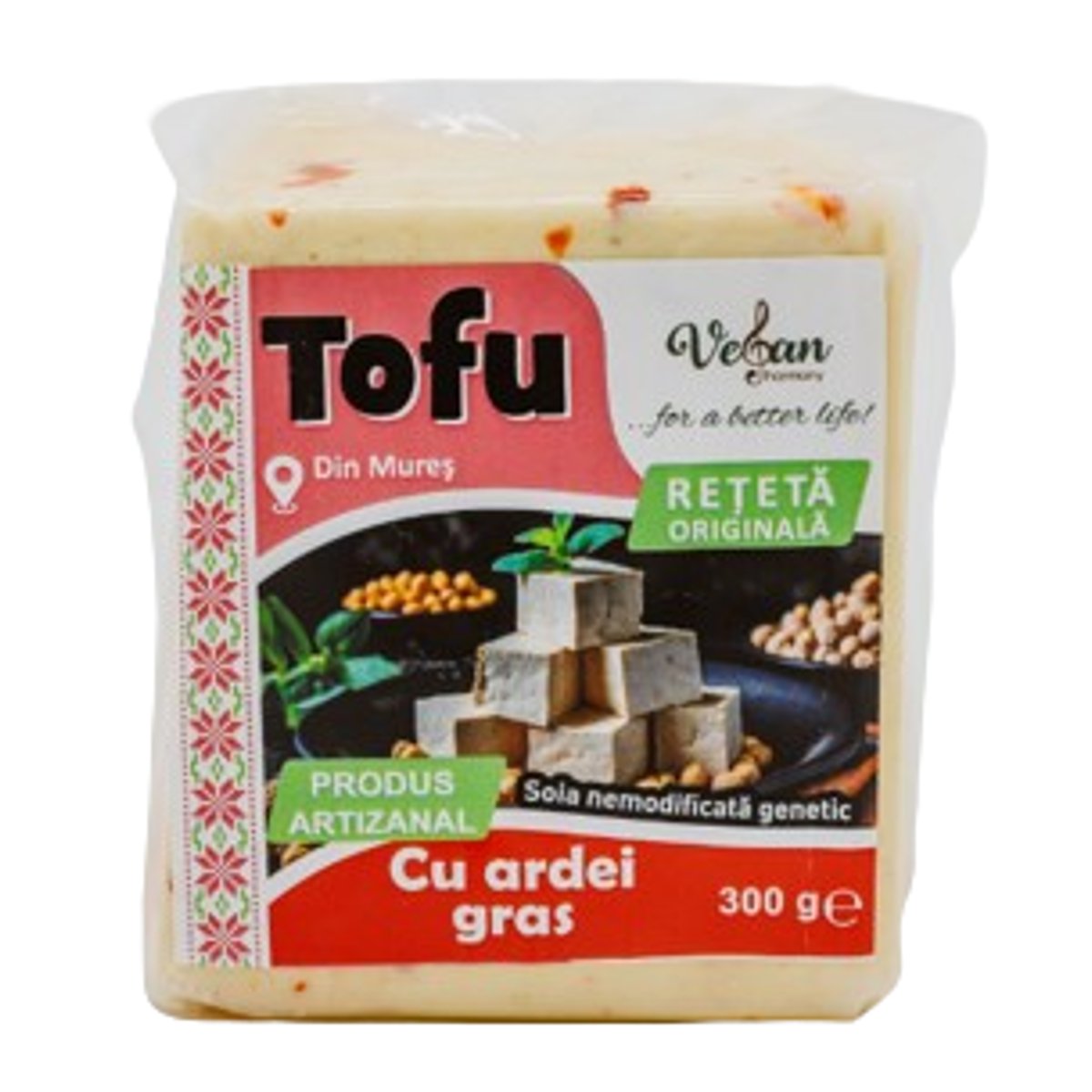 Produs vegetal artizanal obținut din soia nemodificată genetic, conform rețetei originale chinezești. Tofu cu ardei gras este o sursă bogată de proteine și magneziu, potrivit pentru dietele vegane și vegetariene. Produs în România, fără organisme modificate genetic, coloranți sau conservanți artificiali.