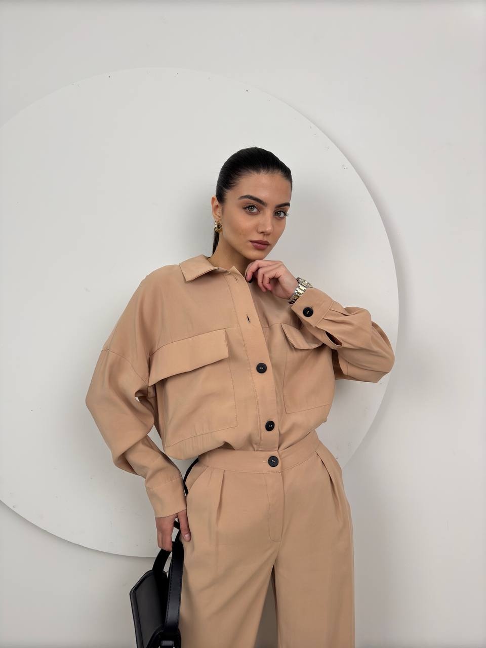 Compleu damă casual “Erika” în nuanță maro, format din bluză cu croială lejeră și pantaloni cu talie elastică. Realizat din material moale, plăcut la atingere, cu textură fină și ușor elastic pentru confort sporit. Bluza are mâneci lungi și guler ușor ridicat, iar pantalonii au croială dreaptă și finisaj relaxat. O alegere perfectă pentru ținute casual, birou sau timp liber, combinând stilul modern cu funcționalitatea.