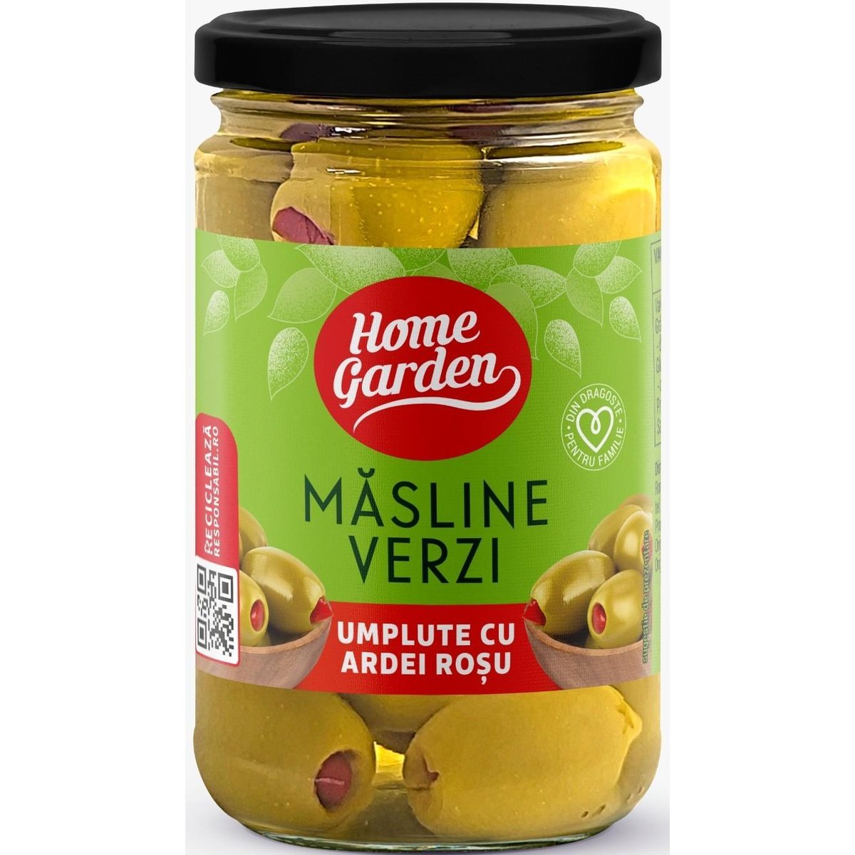Home Garden Masline Verzi Umplute Cu Ardei Rosu atent selectionate si conservate pot fi consumate ca o simpla gustare sau pot da savoare salatelor sau diferitelor preparate culinare. Atentie pot gasi samburi sau bucati de samburi.
