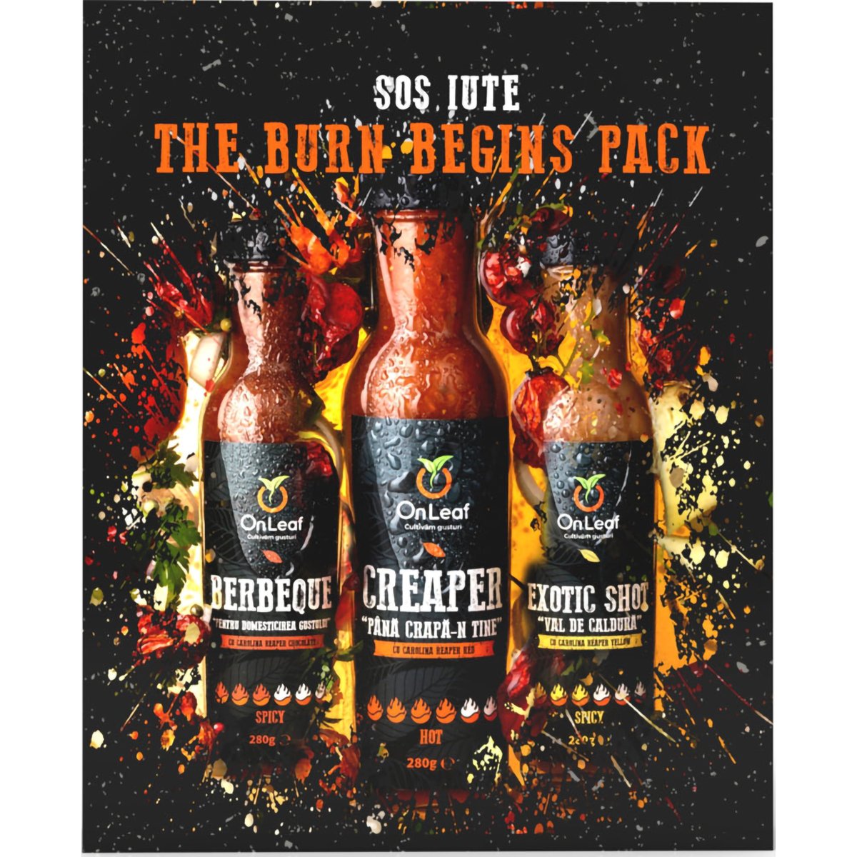 Trei sosuri, in varianta mai iute, trei nuanțe diferite de gust: Berbeque afumat-dulceag, Exotic Shot fructat-exotic, Creaper cu iuțime autentică. Fiecare sticlă are un caracter diferit, dar toate sunt obținute din ingrediente curate și prin fierbere lentă, fără conservanți sau arome concentrate, artificiale.E pentru cei care caută un gust real, nu doar senzație de iute. Cu ardei adevărați, legume, plante și condimente naturale, pachetul este o invitație sinceră la arome memorabile.Mancare mai gustoasa cu:Sosurile din The Burn Begins Pack:•Creaper: rezumat prin “picant bun”, are o iuțime intensă și ușor de observat. E sosul care merge cu orice: carne, paste, pizza și orice preparat ai pus pe masă.•Berbeque: aromat, cu note afumate și ușor dulci, este perfect pentru grătare, burgeri și legume coapte. •Exotic Shot: cu un profil fructat-picant, se potrivește cu carne albă, fructe de mare, tăiței și preparate cu influențe asiatice sau tropicale.Un set de sosuri care acoperă tot: de la mesele de zi cu zi la mâncare comandată online și chiar și preparate selecte cu mai multă personalitate.Informații Suplimentare:Greutate netă: 840 grameA se păstra la loc uscat și răcoros.