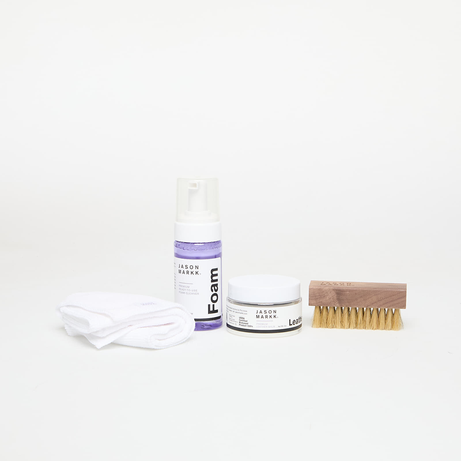 Jason Markk Kit Îngrijire Piele Alb, Balsam premium cu ceară de albine și ulei de cocos, Perie Delicates, Spumă 4 oz, Cârpă microfibră
