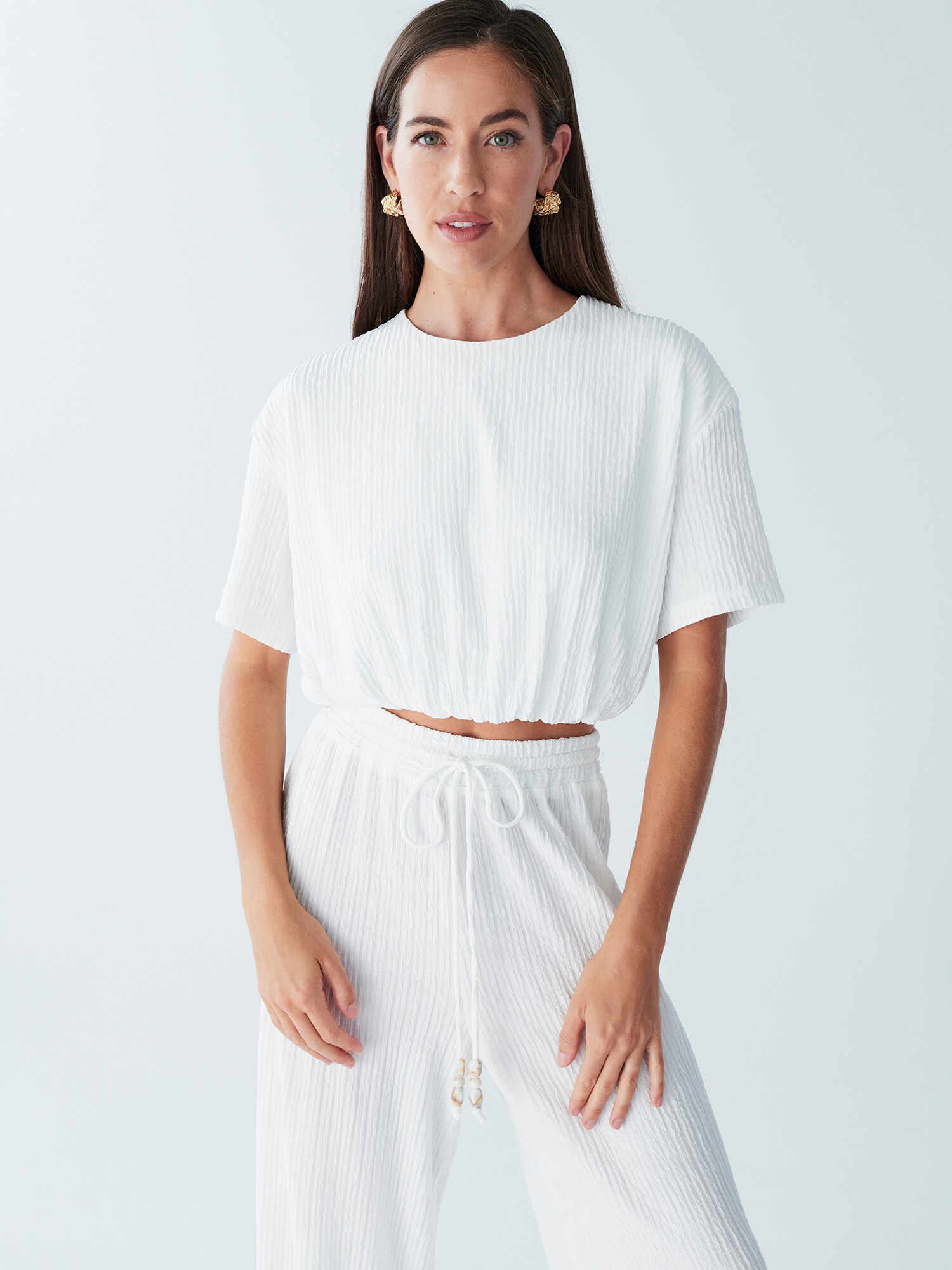 Design: Umăr întretăiat; Material: Jerseu; Decolteu: Decolteu rotund; Imprimeu: Monocrom; Detalii: Drapat; Detalii: Material structurat; Croi: Croi mulat; Lungime mâneci: Mâneci scurte; Lungime: Croi scurt