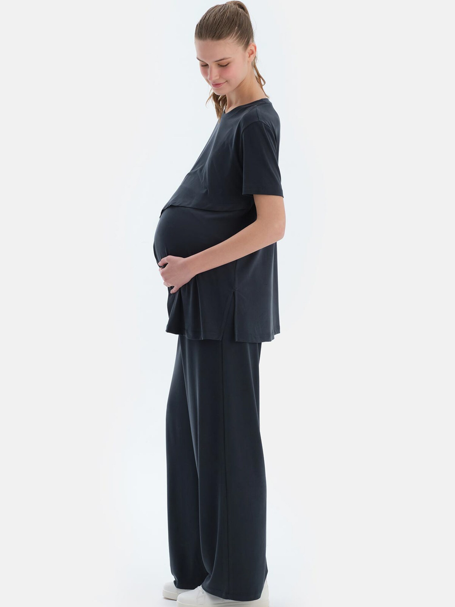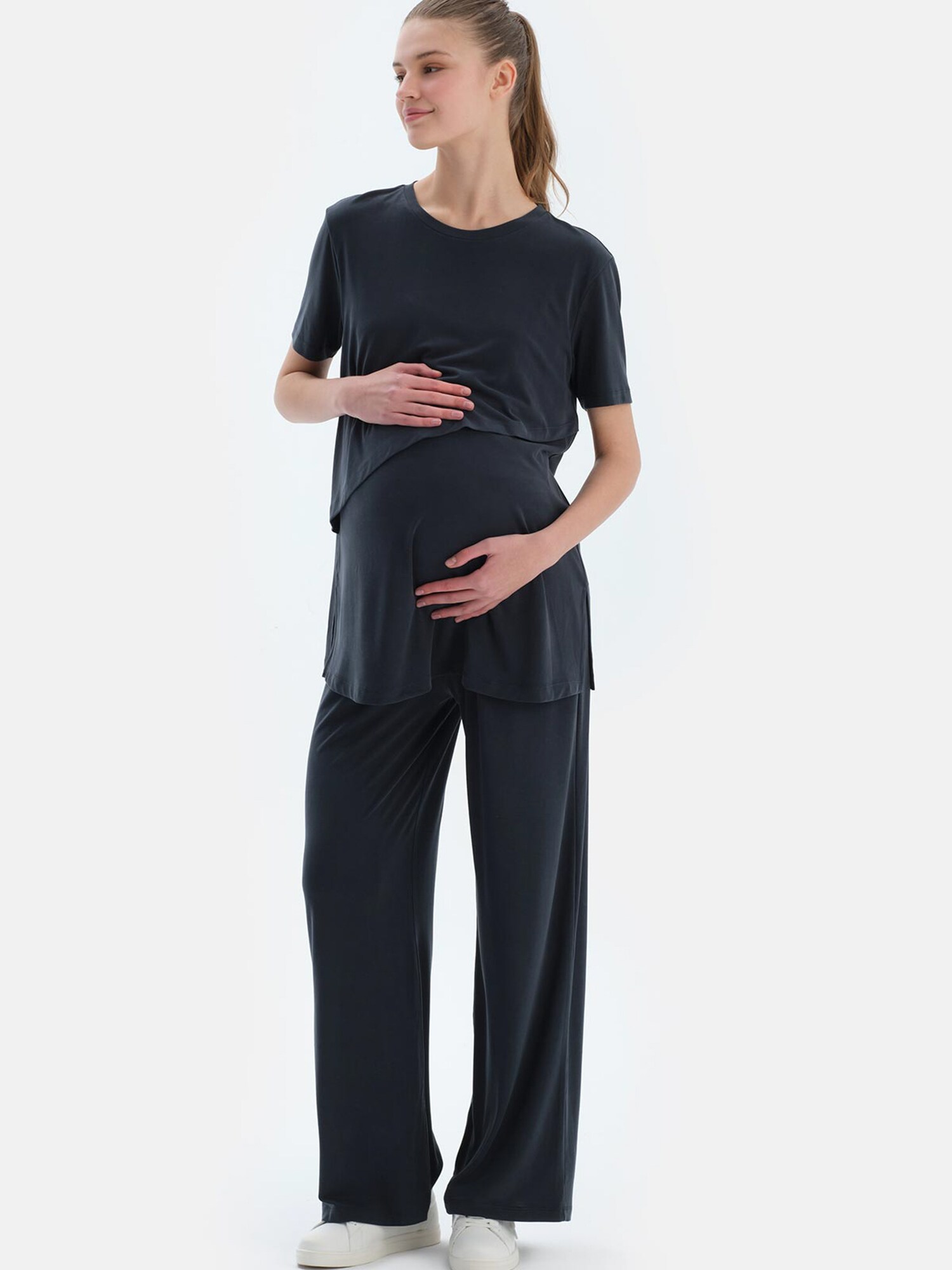 Design: Tiv/ margine tighelită; Material: Jerseu; Decolteu: Decolteu rotund; Imprimeu: Monocrom; Detalii: Cu decupaje; Detalii: Material moale; Funcție de alăptare: Cu funcție de alăptare; Croi: Croi normal; Lungime mâneci: Mâneci scurte; Lungime: Croi lung