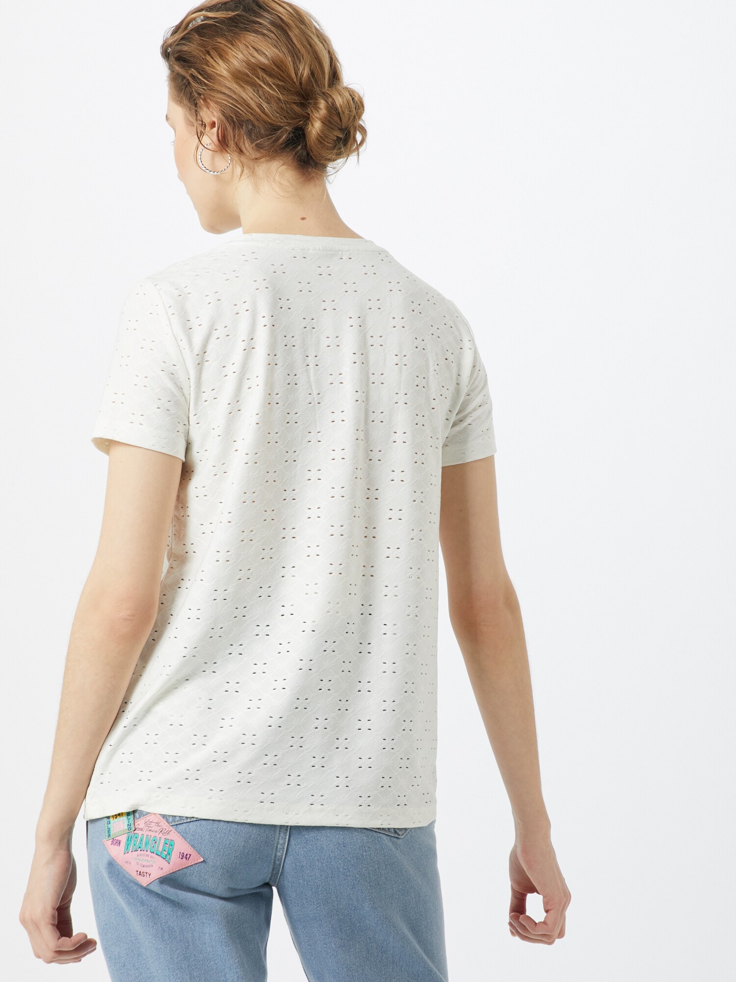 Design: Tiv/ margine tighelită, Tiv drept, Decolteu cu tiv; Material: Jerseu; Decolteu: Decolteu rotund; Imprimeu: Monocrom; Detalii: Broderie, Model cu găuri; Detalii: Cusături ton în ton, Material structurat; Croi: Croi normal; Lungime mâneci: Mâneci scurte; Lungime: Lungime normală