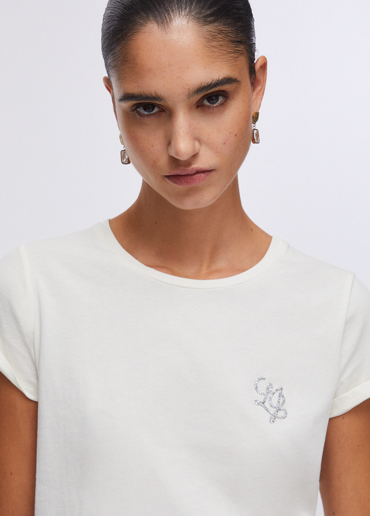 White cotton jersey T-shirt Crew neck Short sleeves Appliqué rhinestones Liu Jo Better product