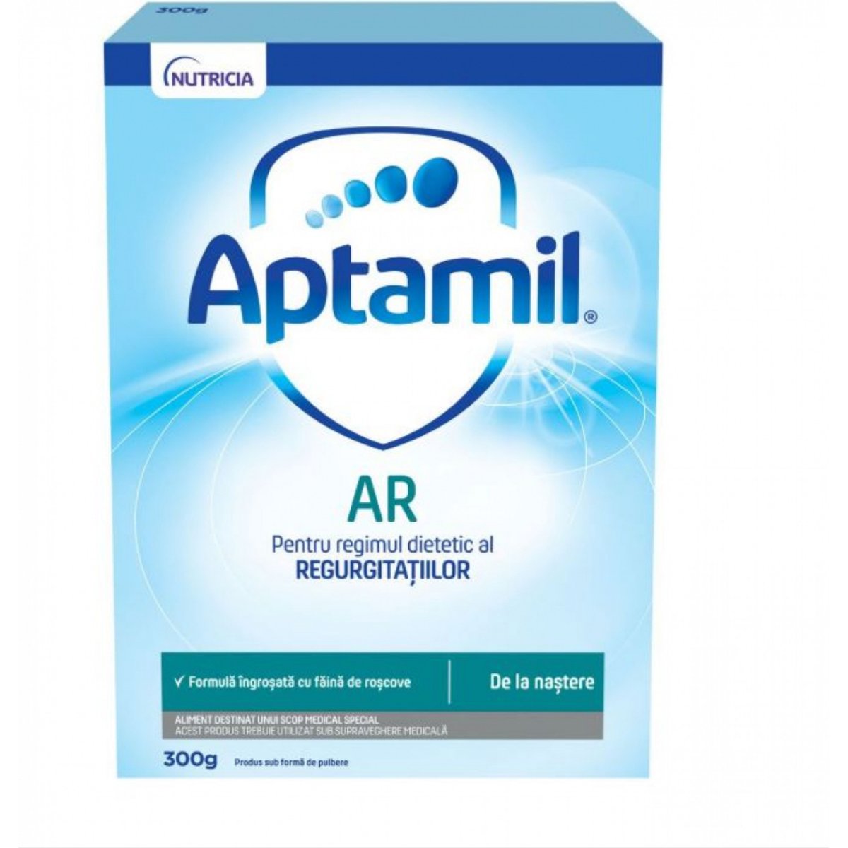 Inspirati de rezultatele a peste 40 de ani de cercetare in sanatatea gastrointestinala,am dezvoltat cea mai avansata formula Aptamil® AR pentru bebelusii cu regurgitatii frecvente. Adesea, bebelusii elimina mici cantitati de lapte dupa o masa, cunoscute in mod obisnuit ca regurgitatii. Totusi, sunt cazuri cand regurgitatiile sunt mai frecvente si este nevoie de o atentie sporita. Aptamil® AR este unic prin mixul de ingrediente pe care il contine. Contine faina de roscove, un agent natural de ingrosare. Fibrele pe care le contine, absorb apa si ingroasa formula de lapte. Noua textura ajuta ca formula ingerata sa ramana in stomacul bebelusului. Ingrosarea formulei de lapte este esentiala in regimul alimentar al regurgitatiilor frecvente. Acesta este un aliment destinat unui scop medical special si trebuie utilizat sub supraveghere medicala. Aptamil AR este o formula completa nutritional pana la 6 luni. Aptamil AR nu este indicat pentru nou-nascutii prematuri Ingrediente: Lactoza (din lapte de vaca), uleiuri vegetale (ulei de palmier, ulei de cocos, ulei de rapita, ulei de floarea-soarelui, ulei de floarea-soarelui bogat in acid oleic), lapte degresat, zer demineralizat (din lapte de vaca), agent de ingrosare (faina de roscove), concentrat din zer (din lapte de vaca), fosfat de calciu, ulei de peste, proteine din zer (din lapte de vaca), citrat de sodiu, ulei din Mortierella alpina, clorura de colina, clorura de potasiu, acid L-ascorbic, citrat de potasiu, clorura de magneziu, emulsifiant (lecitina din soia), inozitol, taurina, sulfat feros, L-triptofan, sulfat de zinc, L-carnitina, sare 5-monofosfat uridina de sodiu, DL-alfa tocoferil acetat, 5-monofosfat citidina, carbonat de calciu, sare 5-monofosfat inozina de sodiu, D-pantotenat de calciu, 5-monofosfat adenozina, nicotinamida, sare 5-monofosfat guanozina de sodiu, sulfat de cupru, DL-alfa tocoferol, retinil palmitat, hidroclorura de tiamina, hidroclorura de piridoxina, riboflavina, acid pteroilmonoglutamic, iodura de potasiu, sulfat de mangan, selenit de sodiu, fitomenadiona, colecalciferol, D-biotina, cianocobalamina Mod de preparare: 1. Spala-te bine pe maini, sterilizeaza toate ustensilele utilizate in prepararea laptelui si asigura-te ca marginea ambalajului este curata. 2. Fierbe apa potabila pentru prepararea laptelui timp de 5 minute, apoi lasa la racit pana la cca 40°C. 3. Toarna intr-un biberon mare cantitatea de apa fiarta si racita, necesara conform dozarii pentru o masa. Nu refolosi apa fiarta. 4. Dozeaza pulberea numai cu lingurita de masura inclusa in pachet, atent nivelata. Nu presa pulberea in exces. Adauga in apa cantitatea corecta de formula de lapte Aptamil® AR. Intotdeauna respecta cu strictete dozarea produsului. Adaugarea unui numar de masuri necorespunzator poate afecta sanatatea copilului. 5. Inchide biberonul. Imediat dupa aceea tine biberonul inchis vertical intre palme si ruleaza-l puternic timp de 5 secunde. Timpul dintre adaugarea pulberii si rularea biberonului trebuie sa fie cat mai scurt posibil. Agita biberonul timp de 20 de secunde. Lasa Aptamil® AR sa stea timp de 7 minute pentru a permite ingrosarea. Apoi fixeaza tetina sterilizata. 6. Intoarce biberonul cu susul in jos chiar inainte de utilizare. Verifica temperatura laptelui preparat pe incheietura mainii tale inainte de a-l administra copilului (cca 37°C).