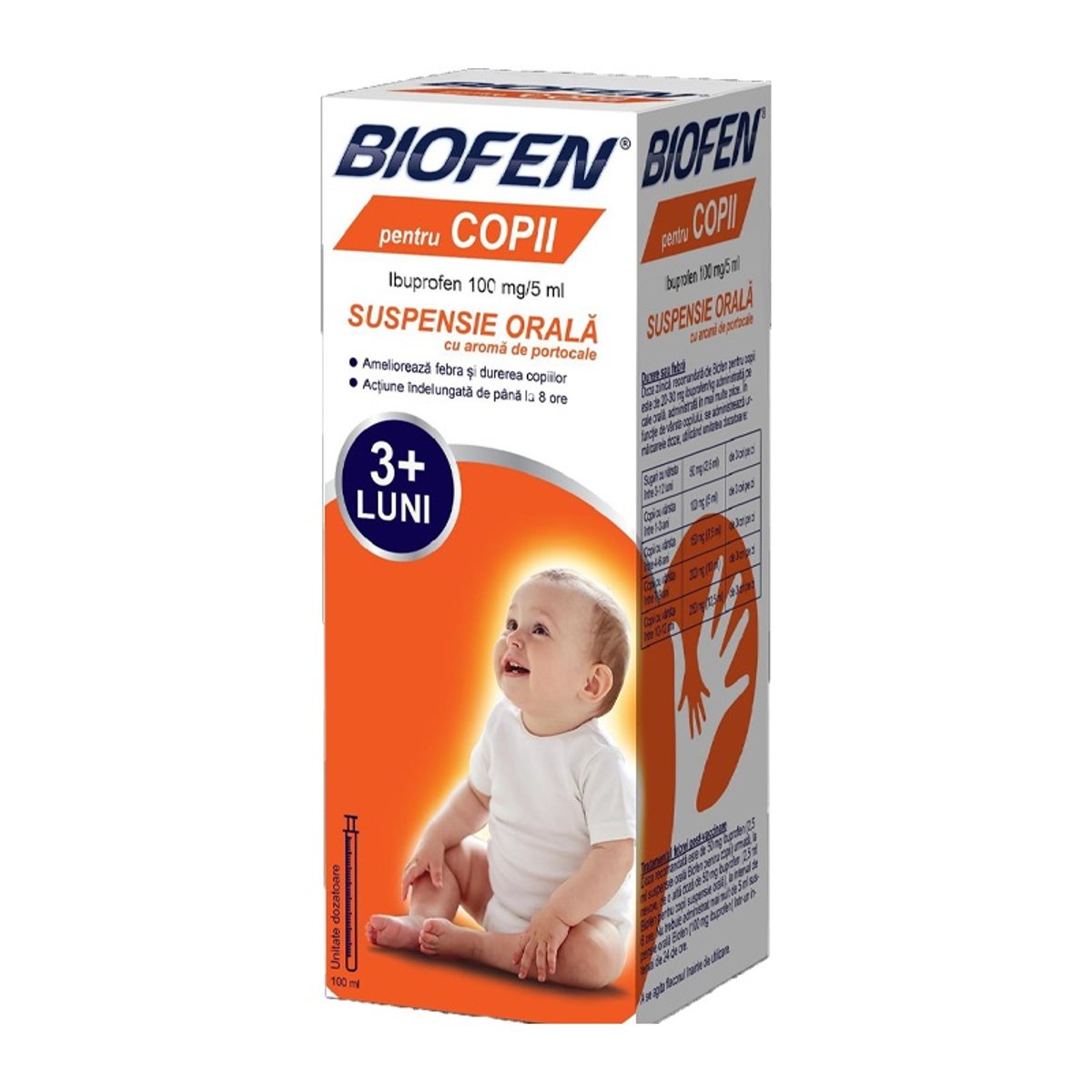 Biofen pentru copii este utilizat pentru ameliorarea simptomatica a: - febrei, inclusiv a febrei post-vaccinare (post-imunizare); - durerilor de intensitate moderata, precum durerea in gat, durerea asociata eruptiei dentare, dureri dentare, cefalee, durerea asociata inflamatiei la nivelul urechii, durerea asociata luxatiilor. Ingrediente: Biofen pentru copii contine ibuprofen 100MG/5ML, substanta care apartine clasei de medicamente numite antiinflamatore nesteroidiene (AINS). AINS modifica raspunsul organismului la durere, inflamatie si febra. Mod de administrare: Intotdeauna administrati Biofen exact asa cum v-a spus medicul dumneavoastra. Trebuie sa discutati cu medicul sau farmacistul daca nu sunteti sigur. Cititi cu atentie prospectul inainte de utilizare. Durere sau febra Doza zilnica recomandata de Biofen este de 20-30 mg ibuprofen/kg administrata pe cale orala, administrata in mai multe prize. In functie de varsta copilului, se administreaza urmatoarele doze, utilizand lingurita dozatoare: Sugari cu varsta intre 3-12 luni Doza recomandata este de 50 mg ibuprofen (2,5 ml suspensie orala Biofen), de 3 ori pe zi. Copii cu varsta intre 1-3 ani Doza recomandata este de 100 mg ibuprofen (5 ml suspensie orala Biofen), de 3 ori pe zi. Copii cu varsta intre 4-6 ani Doza recomandata este de 150 mg ibuprofen (7,5 ml suspensie orala Biofen), de 3 ori pe zi. Copii cu varsta intre 7-9 ani Doza recomandata este de 200 mg ibuprofen (10 ml suspensie orala Biofen), de 3 ori pe zi. Copii cu varsta intre 10-12 ani Doza recomandata este de 250 mg ibuprofen (15 ml suspensie orala Biofen), de 3 ori pe zi. Biofen nu trebuie administrat la copii cu varsta sub 3 luni. Tratamentul febrei post-vaccinare Doza recomandata este de 50 mg ibuprofen (2,5 ml suspensie orala Biofen) urmata, la nevoie, de o alta doza de 50 mg ibuprofen (2,5 ml Biofen suspensie orala), la interval de 6 ore. Nu trebuie administrat mai mult de 5 ml suspensie orala Biofen (100 mg ibuprofen) intr-un interval de 24 de ore. Tratamentul cu Biofen trebuie sa fie de scurta durata. In cazul administrarii Biofen la copii cu varsta peste 6 luni, daca simptomele persista mai mult de 3 zile, va rugam adresati-va medicului dumneavoastra. In cazul administrarii Biofen la copii cu varsta intre 3-6 luni, daca simptomele persista mai mult de 24 de ore, va rugam adresati-va medicului dumneavoastra.