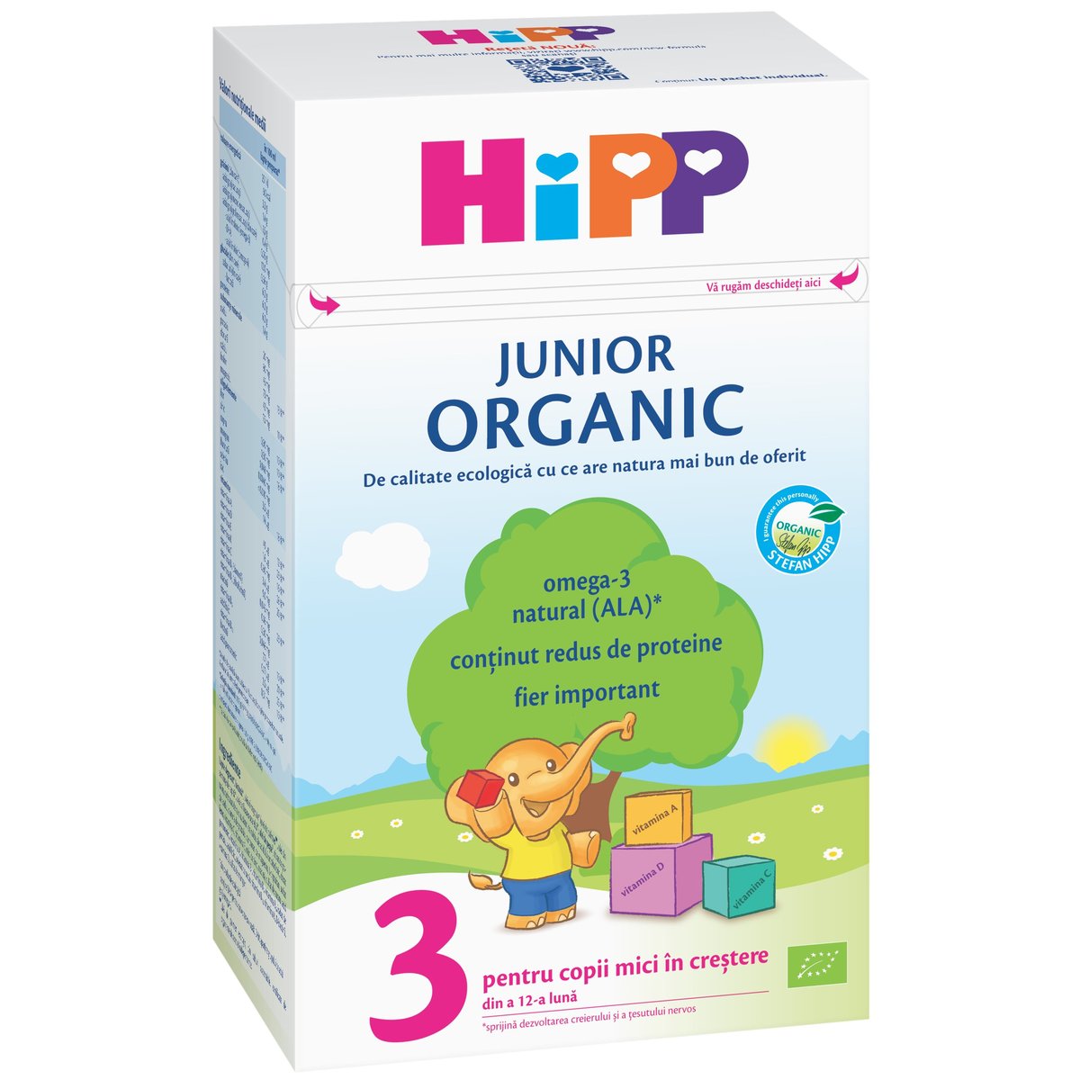 HiPP 3 JUNIOR ORGANIC Lapte pentru copii mici in crestere (500g), chiar si din a 12-a luna, copiii au, in continuare, nevoi nutritionale speciale. HiPP 3 JUNIOR ORGANIC ii ofera copilului dumneavoastra nutrienti importanti, necesari pentru aceasta vârsta, cum ar fi calciu, fier, iod, zinc, dar si vitamine valoroase. Prin continutul de proteine, redus considerabil, HiPP 3 JUNIOR ORGANIC este o componenta valoroasa in dieta copilului dumneavoastra, corespunzatoare vârstei.UtilizareFoarte important! Laptele matern este cea mai buna hrana pentru copilul tau. Se recomanda alaptarea exclusiva culapte matern pentru sugarii cu vârsta de pâna la 6 luni. Acest produs trebuie utilizat numai la indicatia medicului sau aasistentului medical si dupa instruirea mamei privind utilizarea lui.HiPP 3 JUNIOR ORGANIC este potrivit pentru consum, incepând din a 12-a luna, ca bautura la micul dejun, cu cereale, inaintede culcare sau intre mese. HiPP 3 JUNIOR ORGANC poate fi folosit dupa oricare formula de lapte de continuare. Pâna la vârstade 3 ani, puteti folosi HiPP 3 JUNIOR ORGANIC pentru mesele de seara.Informatii importante...despre nutritia copilului dumneavoastraAlaptarea exclusiva in primele 6 luni de viata este cea mai buna modalitate de hranire pentru copilul dumneavoastra. HiPP 3JUNIOR ORGANIC este potrivit pentru copii, incepând din a 12-a luna, ca bautura la micul dejun, cu cereale, inainte de culcaresau, pur si simplu, intre mese. Nu se recomanda ca substituent al laptelui matern in primele 6 luni....despre sanatatea dentara a copilului dumneavoastraHiPP 3 JUNIOR ORGANIC a fost conceput cu intentia de a fi consumat din canita. Daca decideti sa utilizati in continuare biberonul, nu permiteti copilului sa bea singur din biberon pentru perioade lungi de timp. Contactul prelungit al dintilor cu alimentecare contin carbohidrati poate duce la degradarea acestora. Asigurati igiena dentara odata cu aparitia primului dinte, in special,inainte de culcare.Va rugam acordati atentie unei alimentatii echilibrate si unui mod de viata sanatos.De calitate ecologica cu ce are natura mai bun de oferitIngredienteLapte degresat*, lactoza*, uleiuri vegetale* (ulei de palmier , ulei din seminte de rapita*, uleide floarea soarelui*), ulei de peste¹, citrat de potasiu, carbonat de calciu, saruri de calciu aleacidului ortofosforic, citrat de sodiu, clorura de potasiu, carbonat de magneziu, L-triptofan,sulfat feros, Vitamina C (Acid L-ascorbic, L-ascorbat de sodiu, L-ascorbil 6-palmitat), vitaminaE (DL-alfa tocoferil acetat), oxid de zinc, niacina (nicotinamida), acid pantotenic (D-pantotenat de calciu), sulfat de cupru, Vitamina A (acetat de retinil), Vitamina B1 (clorhidrat detiamina), Vitamina B6 (clorhidrat de piridoxina), iodat de potasiu, acid folic, selenat de sodiu,Vitamina K (fitomenadiona), D-biotina, Vitamina D (colecalciferol), sulfat de mangan, Vitamina B12 (cianocobalamina). *din productie ecologica 1contine DHA pentru dezvoltarea vizuala. DHA apartine grupului de acizi grasi omega-3. ❤ulei de palmier ecologic, din culturi sustenabile, certificate de organisme de control independente.Caracteristicile produsuluiChiar si din a 12-a luna, copiii au, in continuare, nevoi nutritionalespeciale. HiPP 3 JUNIOR ORGANIC ii ofera copilului dumneavoastranutrienti importanti, necesari pentru aceasta vârsta, cum ar fi calciu,fier, iod, zinc, dar si vitamine valoroase. Prin continutul de proteine,redus considerabil, HiPP 3 JUNIOR ORGANIC este o componentavaloroasa in dieta copilului dumneavoastra, corespunzatoare vârstei.Valori nutritionale mediiin 100 mllapte preparat*Valorile de analiza sunt subiectul fluctuatiilor tipice produselor naturale.Ambalat in atmosfera protectoare. *Solutia standard: 11,7 g HiPP 3 JUNIOR ORGANIC + 90 ml apa = 100 ml lapte preparat;o masura dozatoare = aprox. 5,9 g HiPP 3 JUNIOR ORGANIC** % din Valoarea Nutritionala de Referinta (VNR)Acest produs a parasit fabrica noastra in conditii perfecte – va rugam sa verificati integritateaambalajului inainte de utilizare.Garantia prospetimiiFolia de protectie garanteaza prospetimea optima si pastrarea aromei. Depozitati la temperaturacamerei, intr-un loc uscat si evitati fluctuatiile de temperatura. Folia si cutia trebuie reciclateseparat.Produsul nedesfacut, depozitat corespunzator,a se consuma de preferinta inainte de:Va rugam deschideti aicivaloare energetica 251 kJ60 kcalgrasimi (din care) 3,3 g acizi grasi saturati 1,4 g acizi grasi mono-nesaturati 1,5 g acizi grasi polinesaturati (din care) 0,4 g - acid linolenic (omega-3) 0,05 g - DHA 12,0 mg - acid linoleic (omega-6) 0,36 gglucide (din care) 6,2 g zaharuri (din care) 6,2 g - lactoza 6,2 gproteine 1,4 gsubstante mineralesodiu 20 mgpotasiu 80 mgclorura 45 mgcalciu 73 mg 13 %**fosfor 42 mgmagneziu 7,5 mg 11 %**oligoelementefier 0,90 mg 10 %**zinc 0,50 mg 10 %**cupru 0,048 mg 18 %**mangan 0,0040 mgfluorura < 0,010 mgseleniu 3,5 µgiod 14 µg 18 %**vitaminevitamina A 49 µg 12 %** vitamina D 1,6 µg 23 %**vitamina E 0,80 mg 16