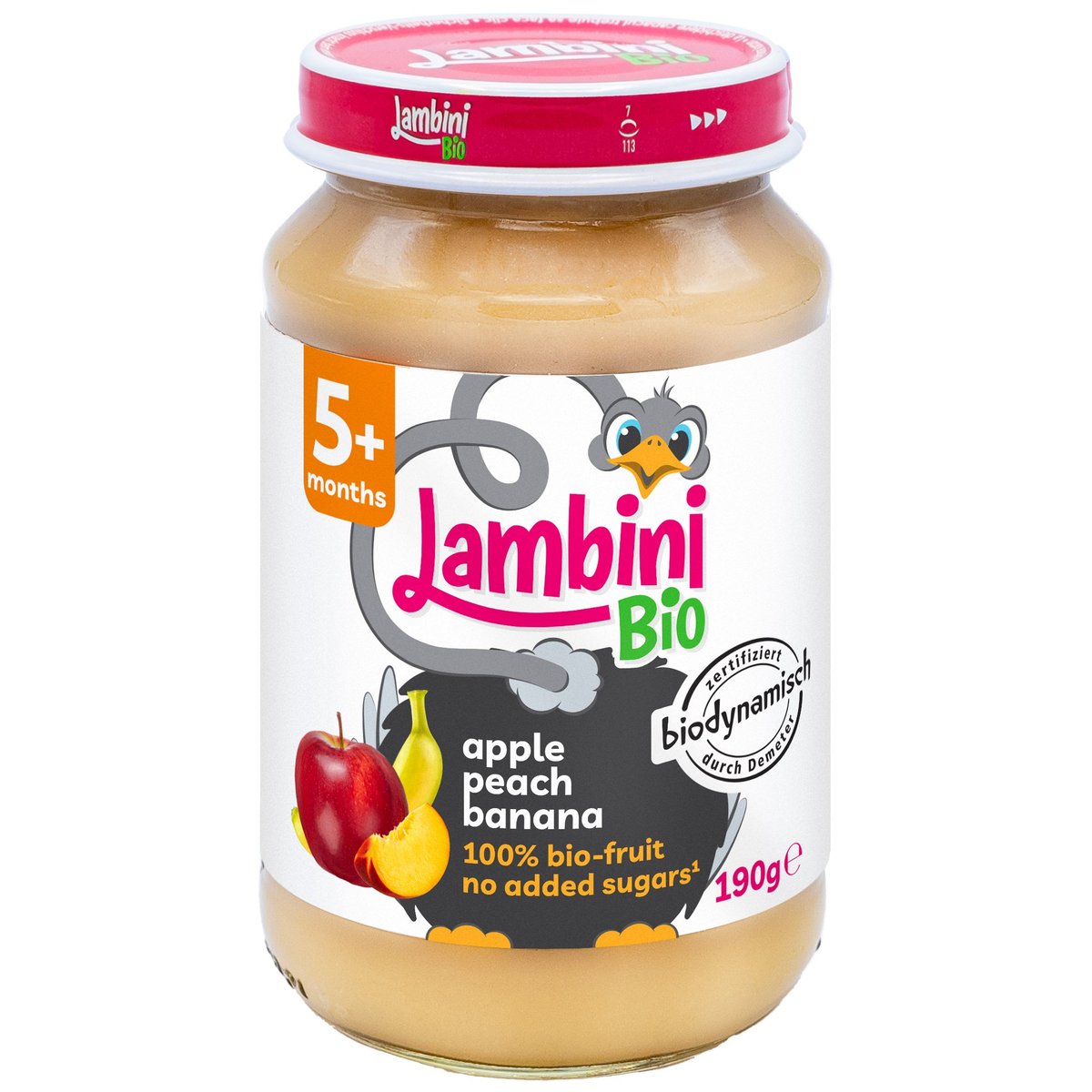 Introducem mancarea pentru bebelusi Lambini Fruit, cu mar, piersica si banana, pentru copii de la 5 luni. Lambini este facuta din piure de fructe 100% care este atat de delicios, incat chiar si merele din livezi ar aplauda cu incantare. Si care este cea mai buna parte? Fara gluten, fara zahar adaugat, fara lactate si fara agenti de ingrosare – doar magie de fructe asa cum a intentionat natura.