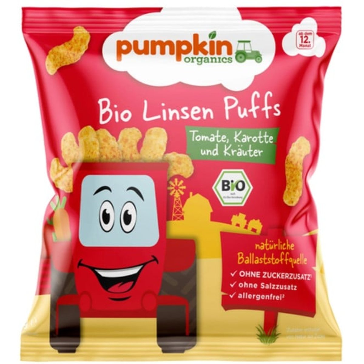 Snack BIO din linte cu rosii*, morcov* si verdeata*, 12 luni+*sub forma de pudra Art. Nr. 21112571 Cantitate neta: 20g ℮ (5 portii)• Sursa naturala de fibre • Fara gluten • Produs vegan• Fara zahar adaugat. Contine zaharuri prezente în mod natural • Fara sare adaugata • Fara alergeni. Evitam în mod voluntar cei 14 alergeni principali din Regulamentul privind informatiile alimentare, printre care gluten, lapte, nuci, arahide, susan si soia. Prin urmare, acest produs nu îi contine.Ideal de consumat ca si gustare la plimbare sau în pauza, din pachetel. Consumati acest produs numai daca ambalajul este nedeteriorat. Ca mama, stiu ca nu este totdeauna usor sa aduci totul sub acelasi acoperis. De aceea, este importanta asigurarea unei diete echilibrate fara a pierde mult timp pentru asta. Pentru ca alimentatia adecvata este baza pentru ca ai nostri copii sa descopere lumea cu bucurie si sa creasca fericiti. Când vine vorba de gustari, eu, personal, prioritizez legumele multe, apoi putina fructoza, fara zahar adaugat si neaparat calitate organica. Desigur, totul trebuie sa aiba un gust delicios. De aceea am fondat Pumpkin Organics. Jaclyn Fabricat în Italia, sub standarde ecologice (IT-BIO-014). Agricultura UE/Non-UE.A se depozita la loc uscat si racorosA se pastra la loc uscat, ferit de lumina. A se depozita nedesfacut la max. 25°C.IMPORTANT: A se consuma de copii numai sub supraveghere si nu atunci când stau întinsi sau sunt în miscare deoarece se pot sufoca. Acordati atentie unei alimentatii echilibrate, unui stil de viata sanatos si unei îngrijiri dentare minutioase pentru a proteja dintii sugarilor si a copiilor mici de carii.