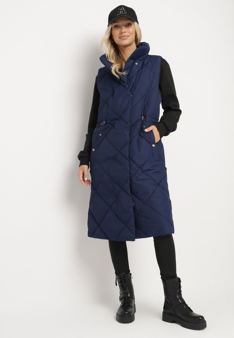 Vestă bleumarin matlasată lungă cu guler înalt și buzunare Avatheia